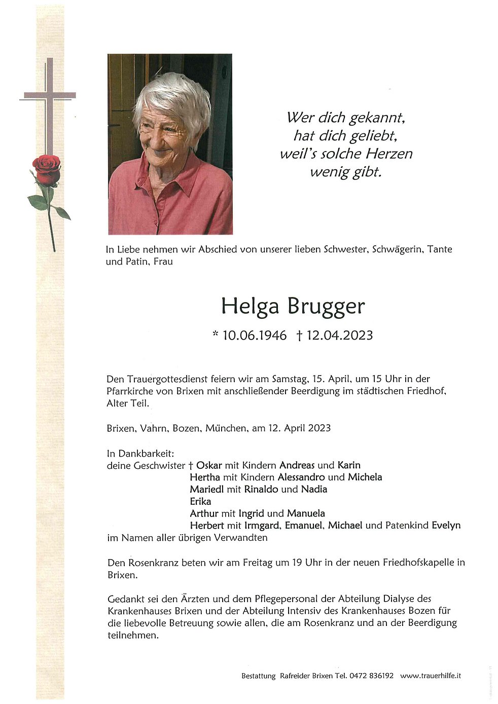 Den Trauergottesdienst feiern wir am Samstag, 15. April, um 15 Uhr in der Pfarrkirche von Brixen mit anschließender Beerdigung im städtischen Friedhof, Alter Teil.