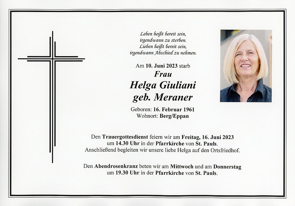 Den Trauergottesdienst feiern wir am Freitag, den 16. Juni um 14.30 Uhr in der Pfarrkirche von St. Pauls.