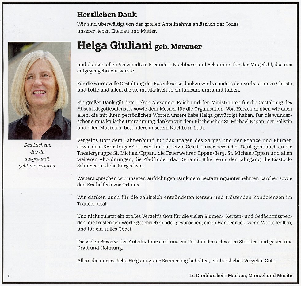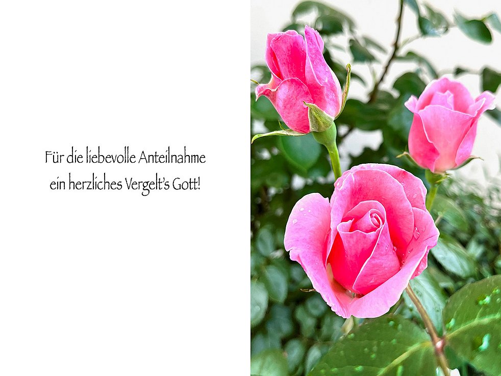 Mit traurigem Herzen, aber in dankbarer Liebe für alles Gute, das sie für uns getan hat, verabschieden wir uns von meiner lieben Frau, unserer Mama, Tochter, Schwester, Schwägerin, Nichte, Patenkind, Tante und Patin