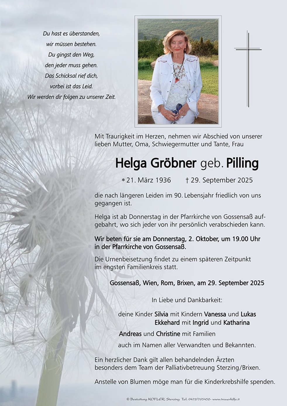 Helga ist ab Donnerstag in der Pfarrkirche von Gossensaß aufgebahrt, wo sich jeder von ihr persönlich verabschieden kann.