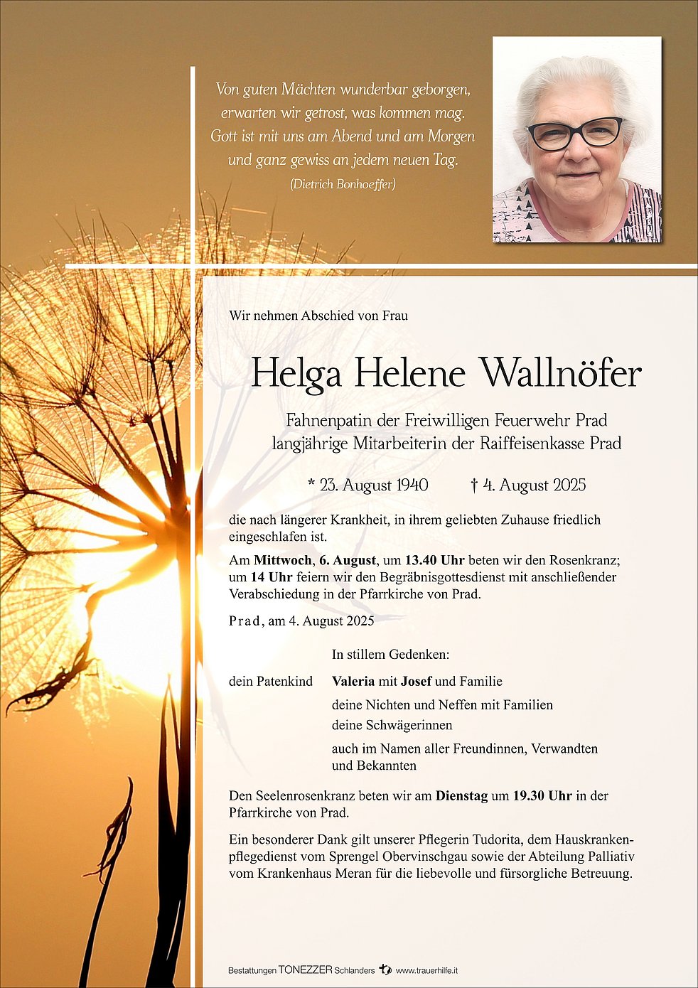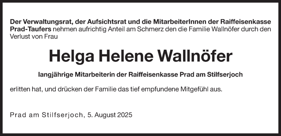 Am Mittwoch, 6. August, um 13.40 Uhr beten wir den Rosenkranz; um 14 Uhr feiern wir den Begräbnisgottesdienst mit anschließender Verabschiedung in der Pfarrkirche von Prad.