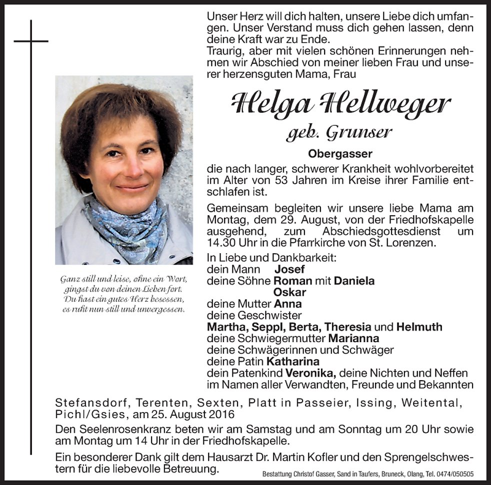 Gemeinsam begleiten wir unsere liebe Mama am Montag, dem 29. August, von der Friedhofskapelle ausgehend, zum Abschieds-gottesdienst um 14.30 Uhr in die Pfarrkirche von St. Lorenzen. Anschließend übergeben wir sie der geweihten Erde.