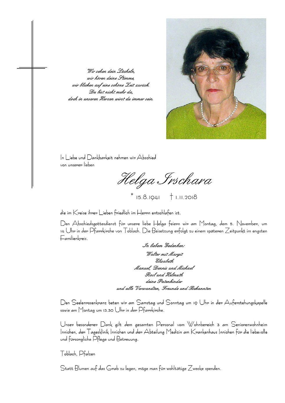 Den Abschiedsgottesdienst für unsere liebe Helga feiern wir am Montag, dem 5. November, um 14 Uhr in der Pfarrkirche von Toblach. Die Beisetzung erfolgt zu einem späteren Zeitpunkt im engsten Familienkreis.