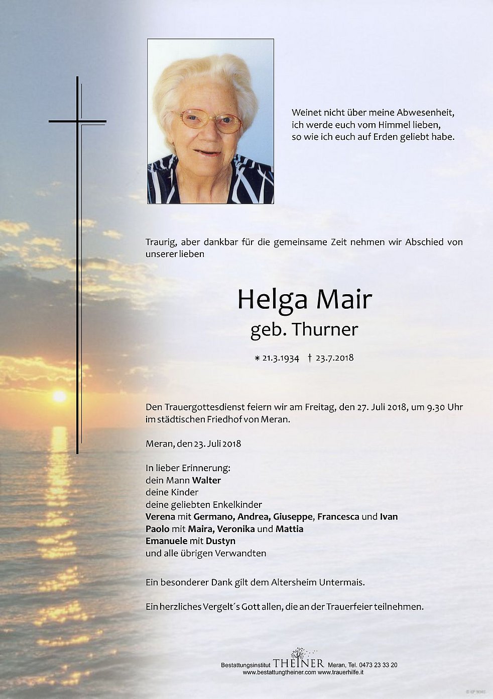 Den Trauergottesdienst feiern wir am Freitag, den 27. Juli 2018, um 9.30 Uhr im städtischen Friedhof von Meran.