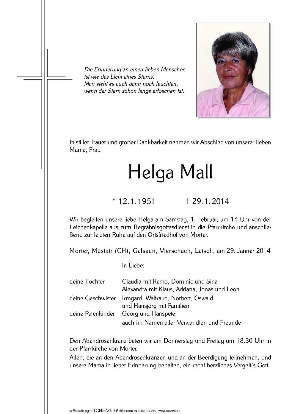 Wir begleiten unsere liebe Helga am Samstag, 1. Februar, um 14 Uhr von der Leichenkapelle aus zum Begräbnisgottesdienst in die Pfarrkirche und anschließend zur letzten Ruhe auf den Ortsfriedhof von Morter.