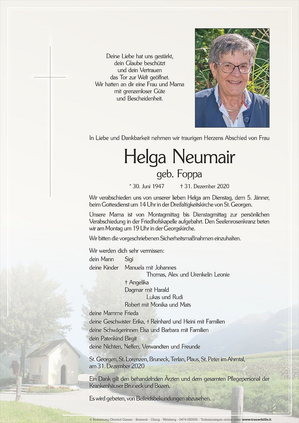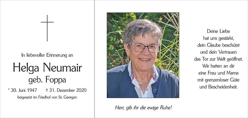 Wir verabschieden uns von unserer lieben Helga am Dienstag, dem 5. Jänner, beim Gottesdienst um 14 Uhr in der Dreifaltigkeitskirche von St. Georgen.