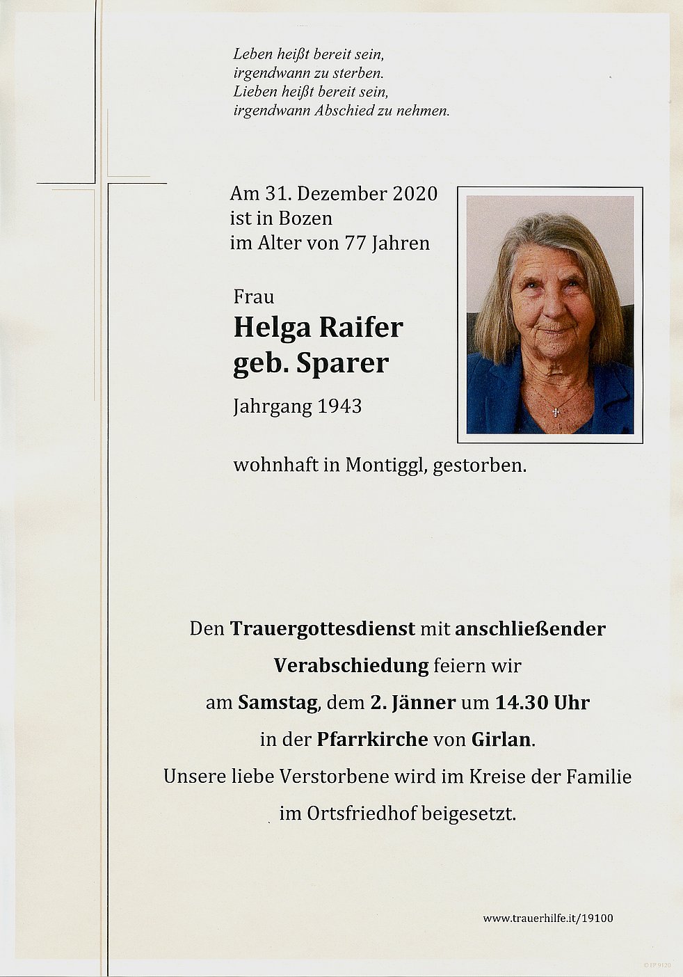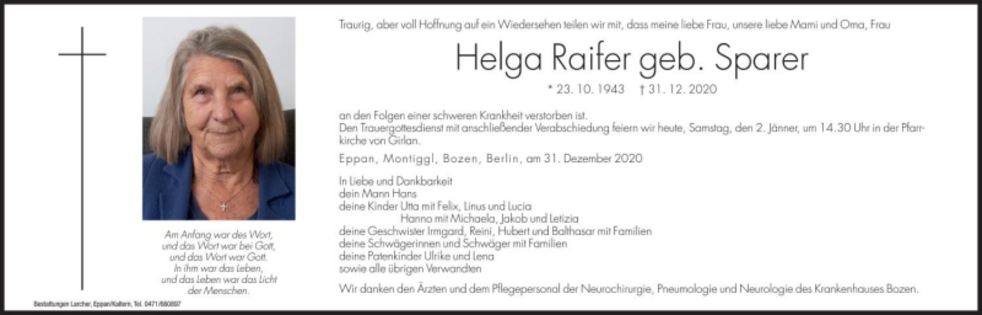 Den Trauergottesdienst mit anschließender Verabschiedung feiern wir am Samstag, dem 2. Jänner, um 14.30 Uhr in der Pfarrkirche von Girlan.