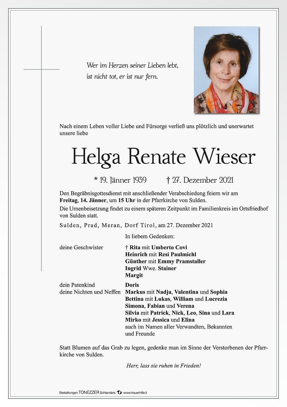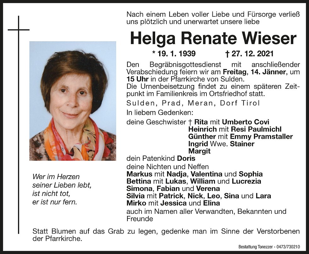 Den Begräbnisgottesdienst mit anschließender Verabschiedung feiern wir am Freitag, 14. Jänner, um 15 Uhr in der Pfarrkirche von Sulden.