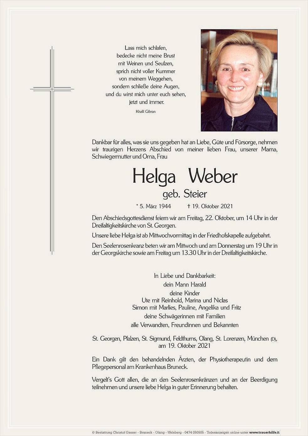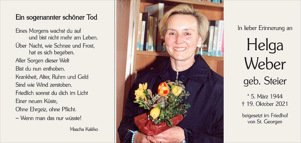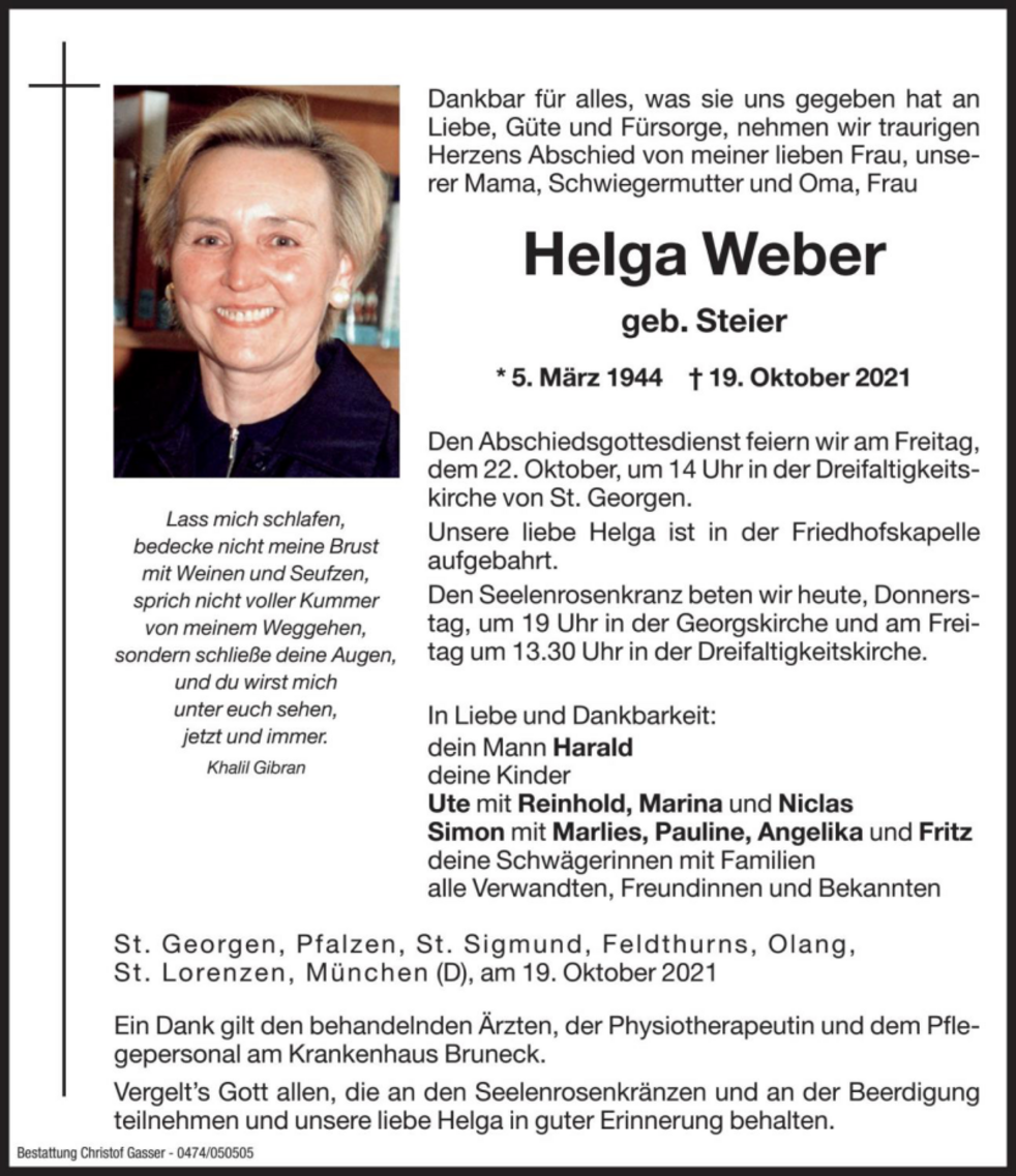 Vergelt’s Gott allen, die an den Seelenrosenkränzen und an der Beerdigung teilnehmen und unsere liebe Helga in guter Erinnerung behalten.