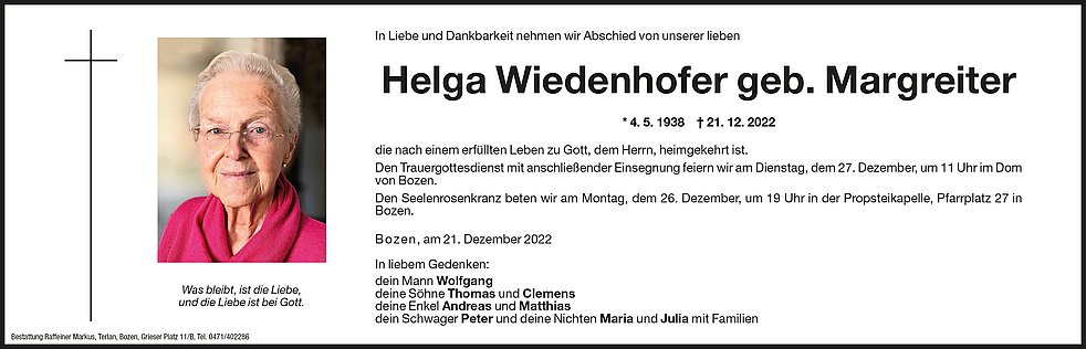 Den Trauergottesdienst mit anschließender Einsegnung feiern wir am Dienstag, dem 27. Dezember, um 11 Uhr im Dom von Bozen.