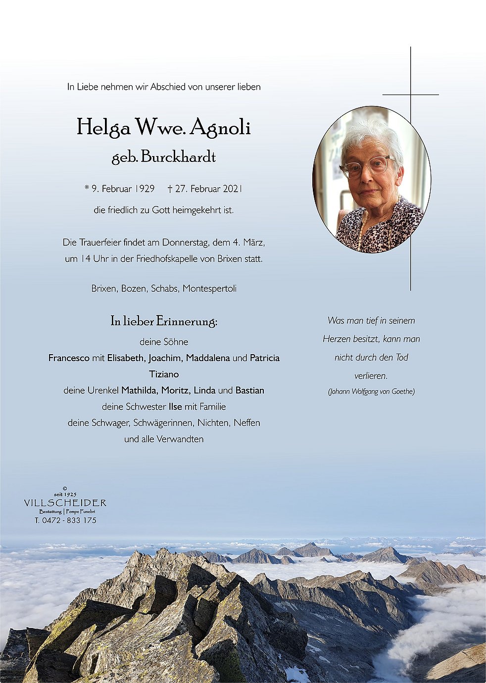 Mütter sterben nicht.Sie sind bei uns,wenn sie gegangen,sie halten fester uns umfangen,vertrauter wird uns ihr Gesicht.Mütter sterben nicht.Was sie in unserm Leben an Kraft u.Freude je gegeben,strahlt weiter uns als stilles Licht.Mütter sterben nicht.Sie gehen mur einen Schritt voran,wie sie's im Leben oft getan u.weisen uns die wahre Sicht.Mütter sterben nicht.Die Menschen,die von uns gehen u.die wir lieben,verschwinden nicht,sie sind immer an unserer Seite.Lieber Francesco unser aufrichtiges Beileid.