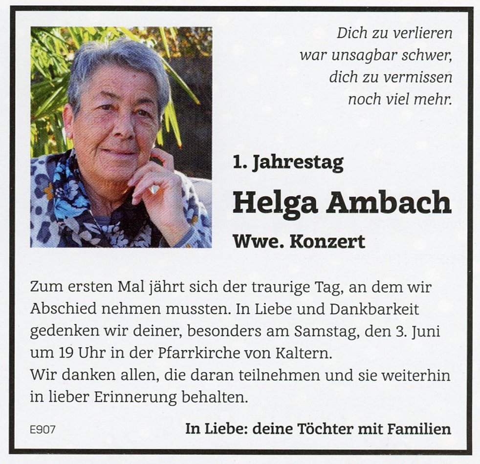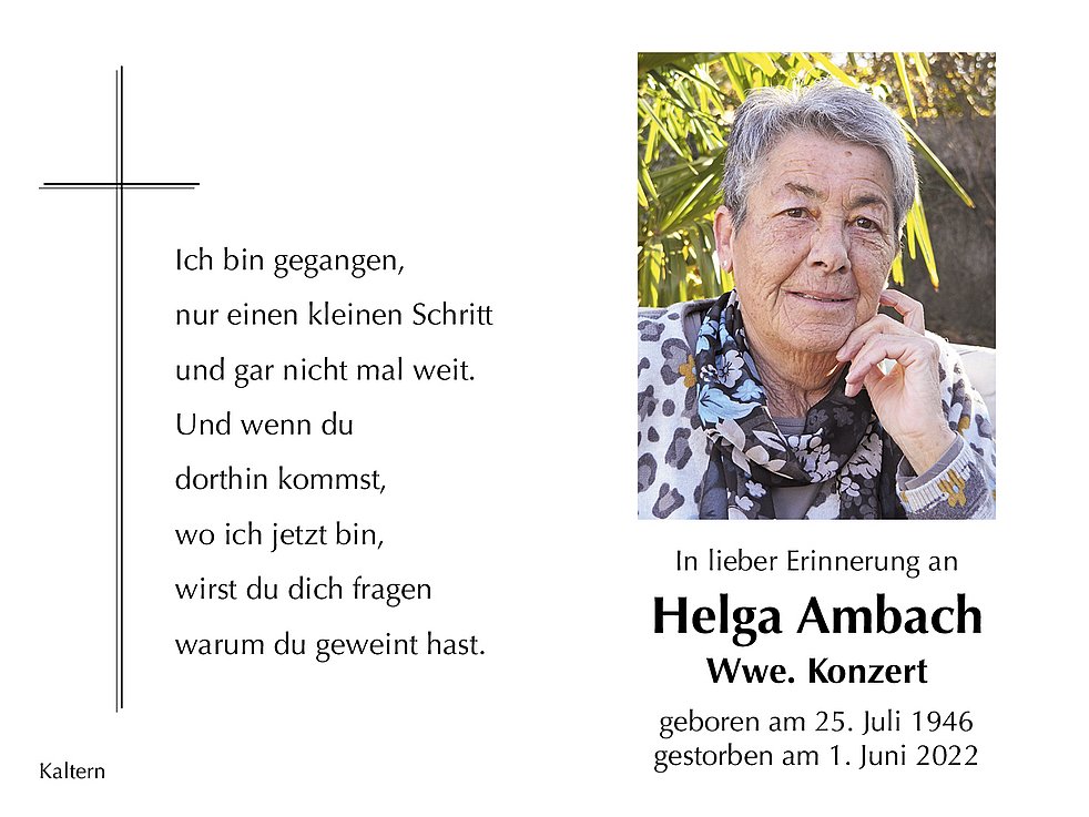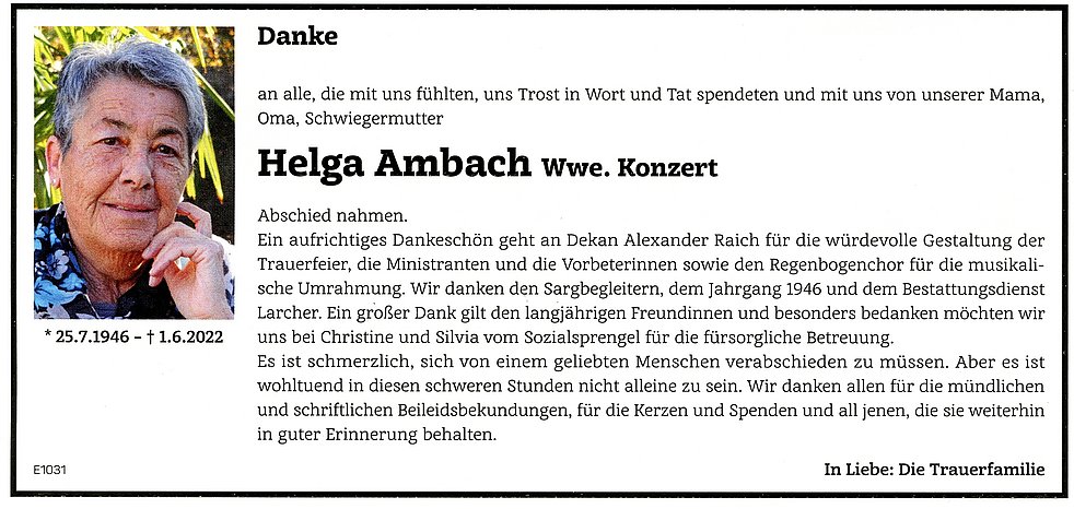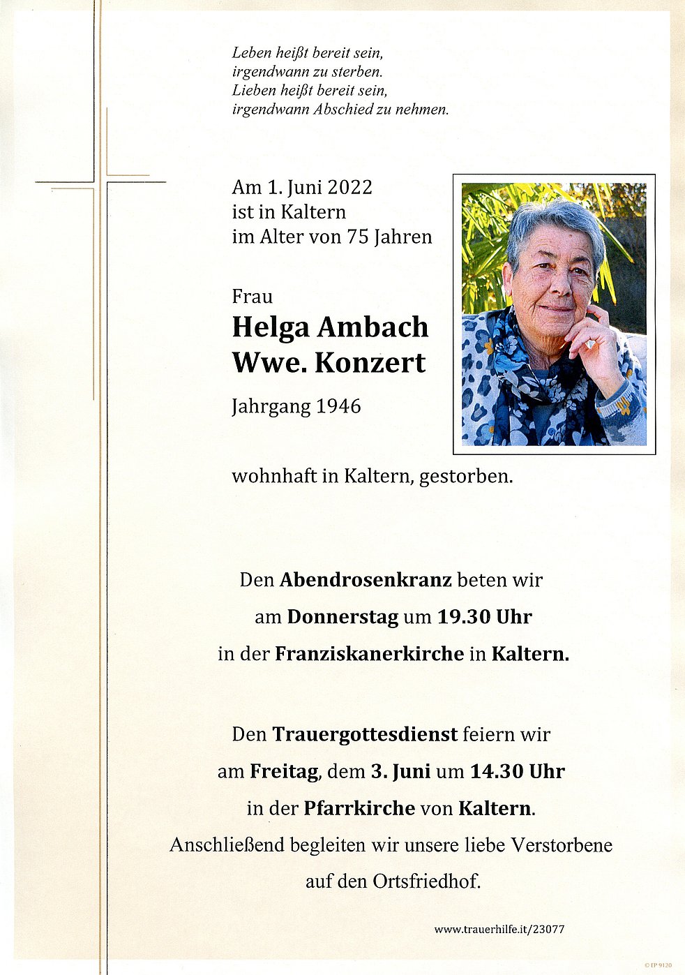 Den Trauergottesdienst feiern wir am Freitag, dem 3. Juni um 14.30 Uhr in der Pfarrkirche von Kaltern. Anschließend begleiten wir unsere liebe Verstorbene auf den Ortsfriedhof.