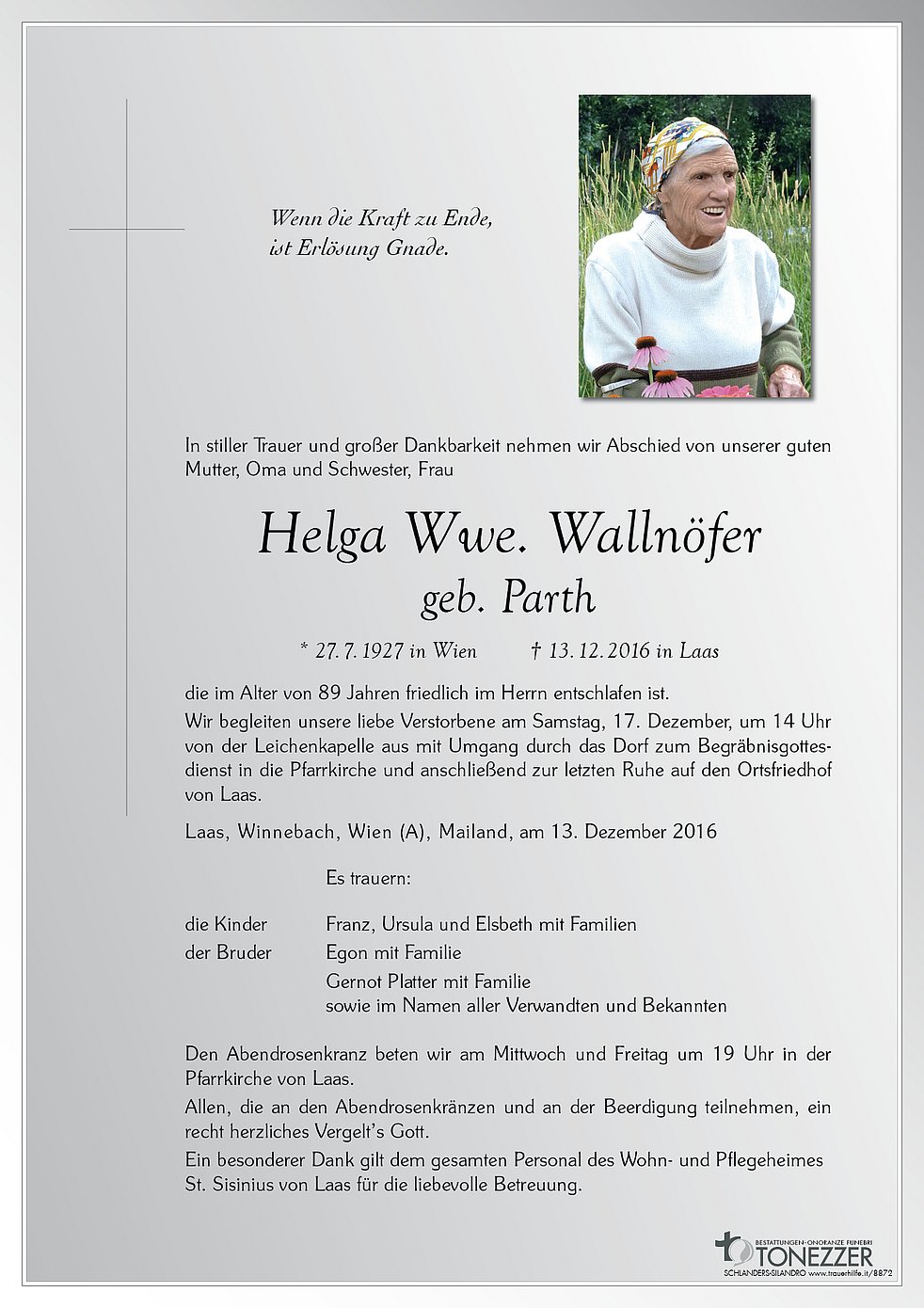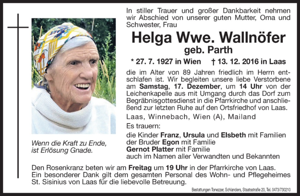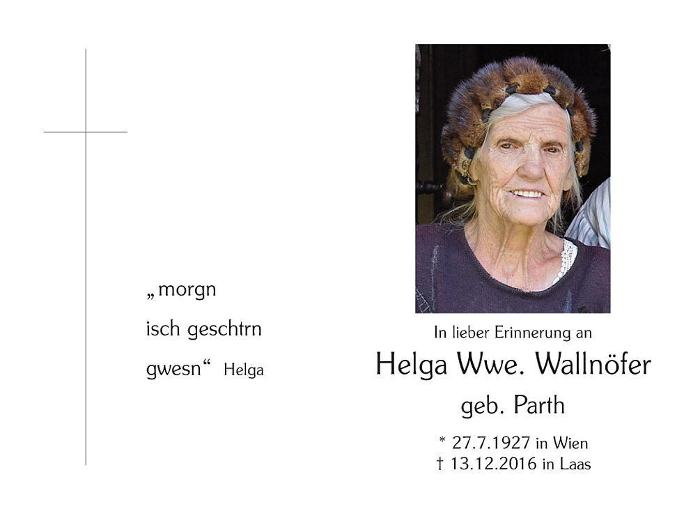 Wir begleiten unsere liebe Verstorbene am Samstag, 17. Dezember, um 14 Uhr von der Leichenkapelle aus mit Umgang durch das Dorf zum Begräbnisgottesdienst in die Pfarrkirche und anschließend zur letzten Ruhe auf den Ortsfriedhof von Laas.