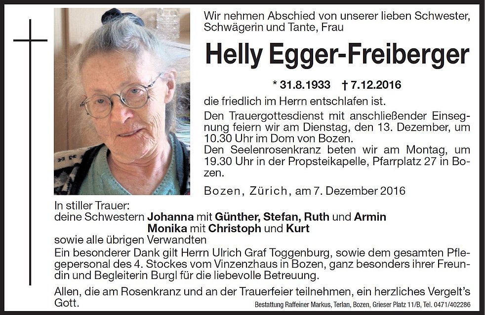 Den Trauergottesdienst mit anschlieβender Einsegnung feiern wir am Dienstag, den 13. Dezember, um 10.30 Uhr im Dom von Bozen.