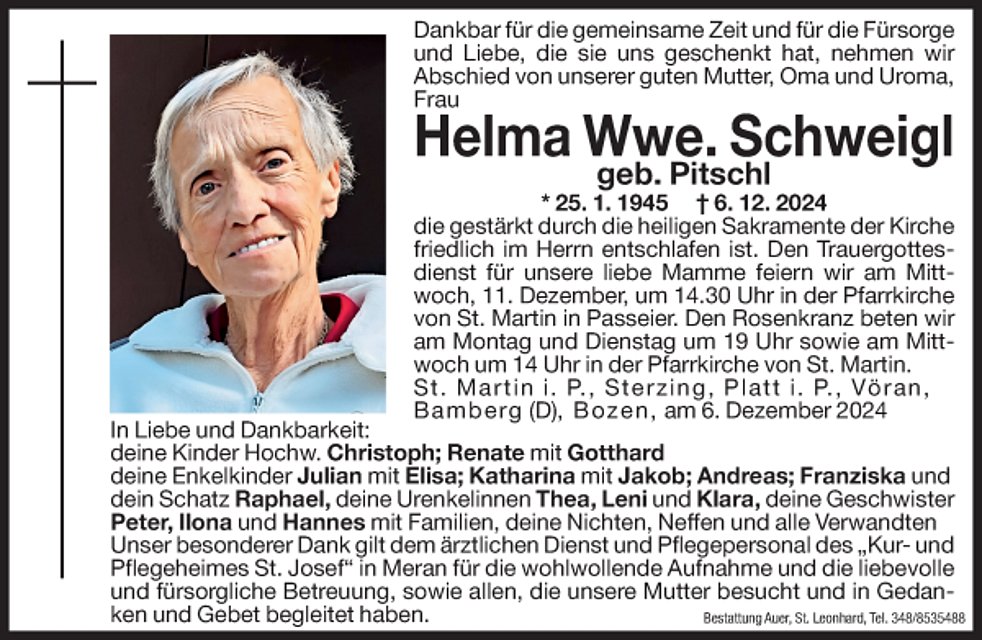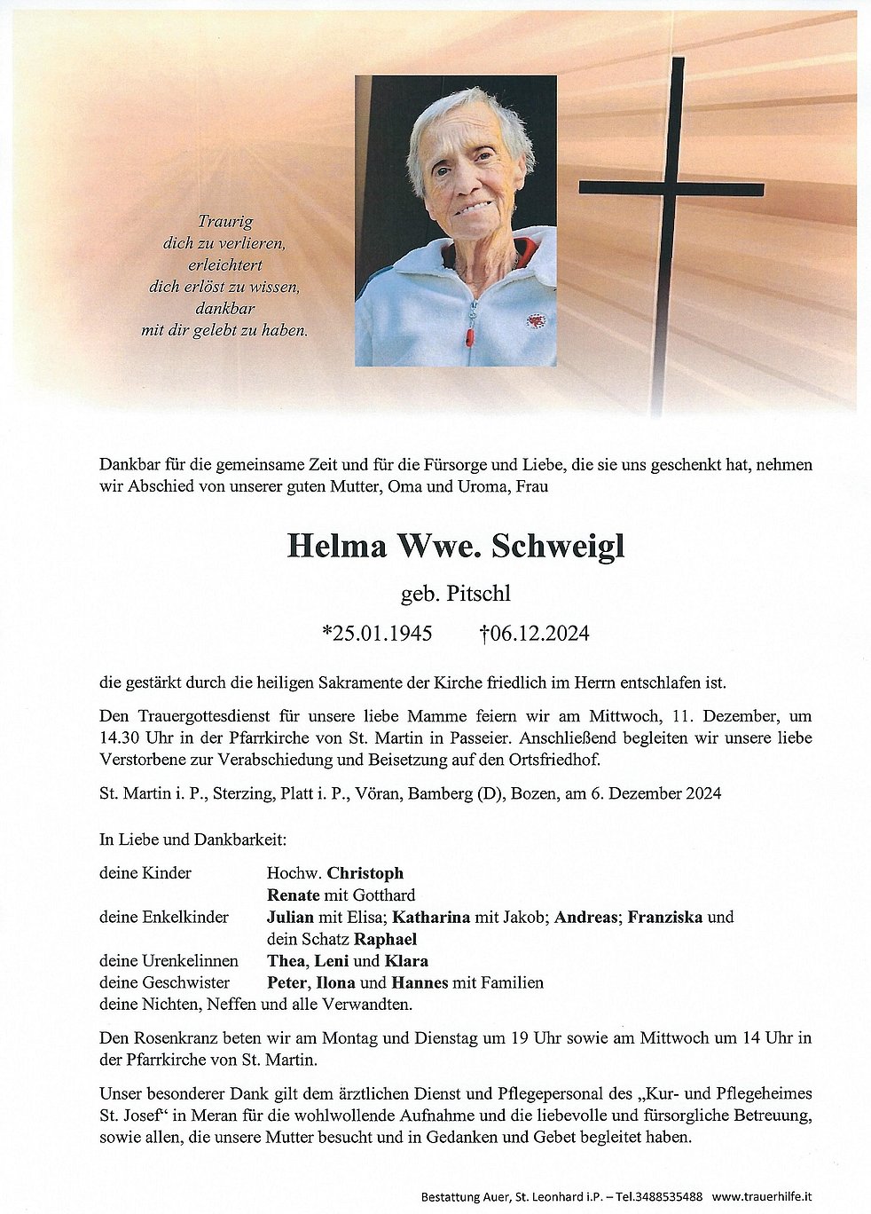 Den Trauergottesdienst für unsere liebe Mamme feiern wir am Mittwoch, 11. Dezember, um 14.30 Uhr in der Pfarrkirche von St. Martin in Passeier. Anschließend begleiten wir unsere liebe Verstorbene zur Verabschiedung und Beisetzung auf den Ortsfriedhof.