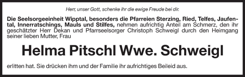 Unser besonderer Dank gilt dem ärztlichen Dienst und Pflegepersonal des „Kur- und Pflegeheimes St. Josef“ in Meran für die wohlwollende Aufnahme und die liebevolle und fürsorgliche Betreuung, sowie allen, die unsere Mutter besucht und in Gedanken und Gebet begleitet haben.