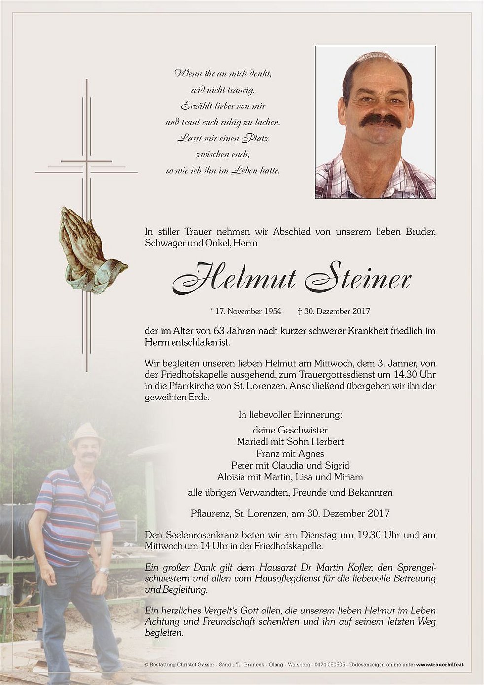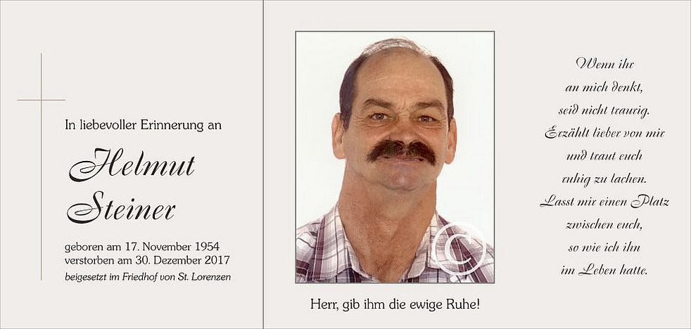 Wir begleiten unseren lieben Helmut am Mittwoch, dem 3. Jänner, von der Friedhofskapelle ausgehend, zum Trauergottesdienst um 14.30 Uhr in die Pfarrkirche von St. Lorenzen. Anschließend übergeben wir ihn der geweihten Erde.