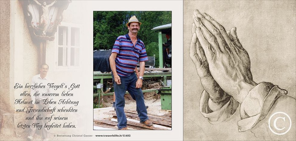 Ein herzliches Vergelt’s Gott allen, die unserem lieben Helmut im Leben Achtung und Freundschaft schenkten und ihn auf seinem letzten Weg begleiten.