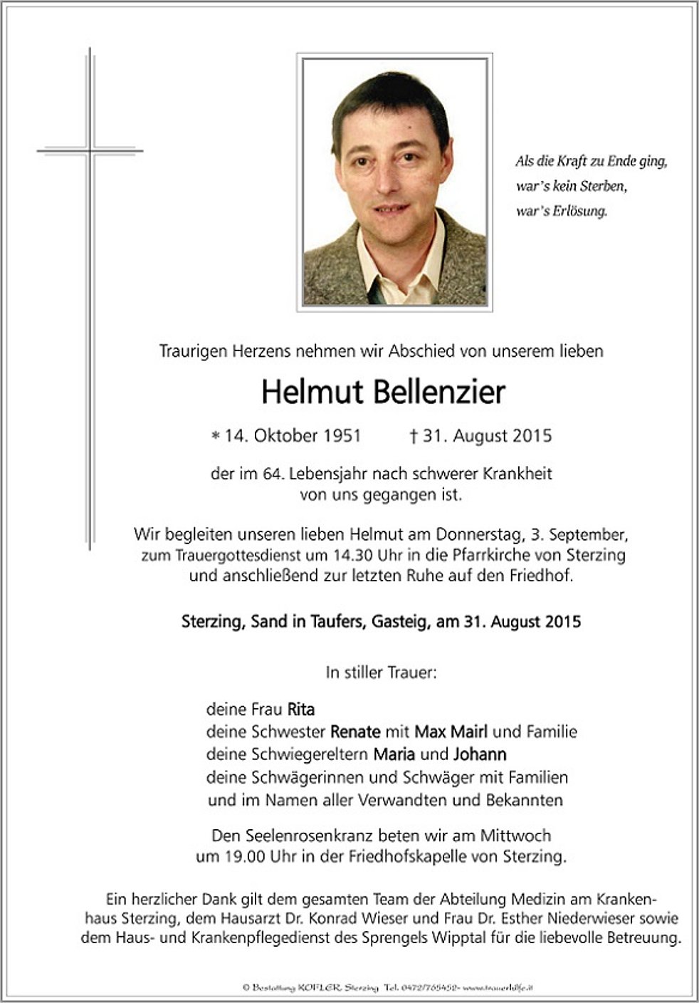Ein herzlicher Dank gilt dem gesamten Team der Abteilung Medizin am Krankenhaus Sterzing, dem Hausarzt Dr. Konrad Wieser und Frau Dr. Esther Niederwieser sowie