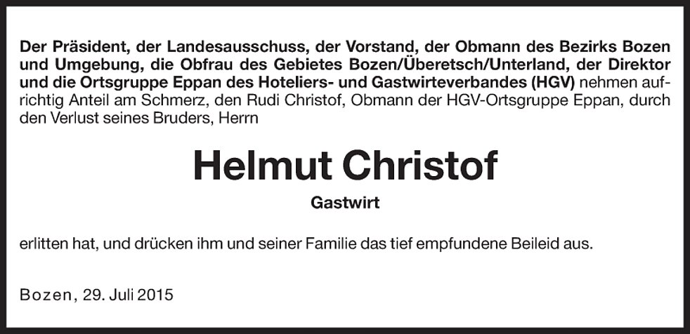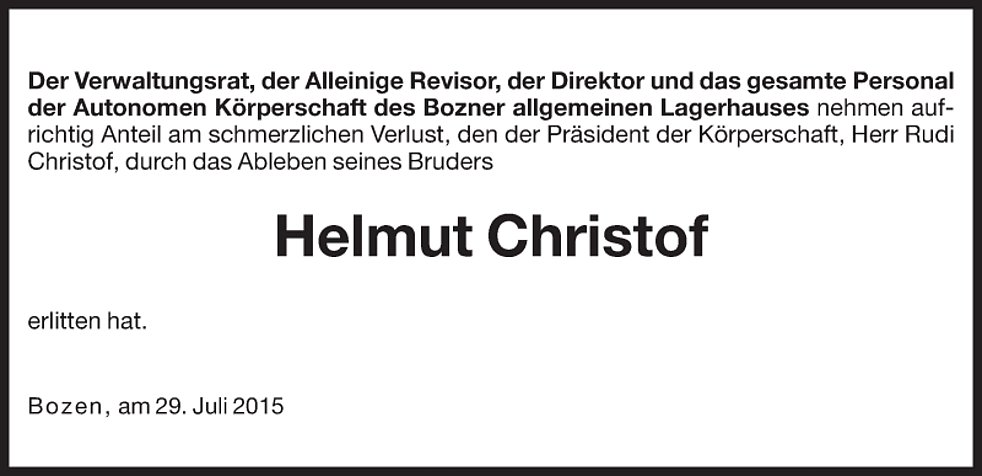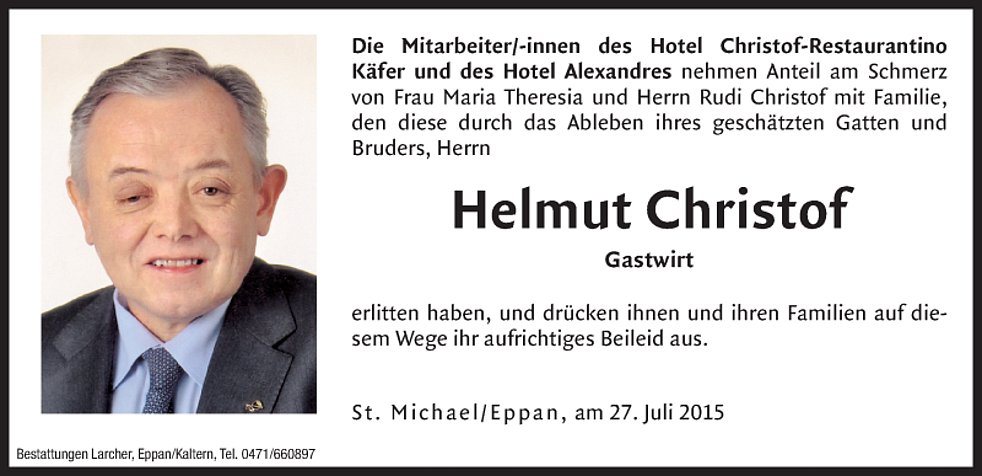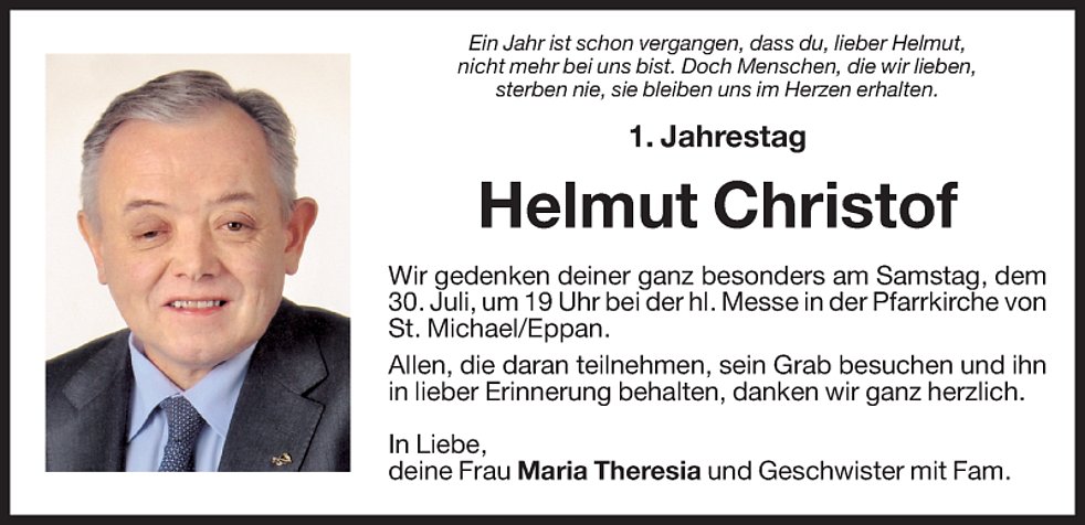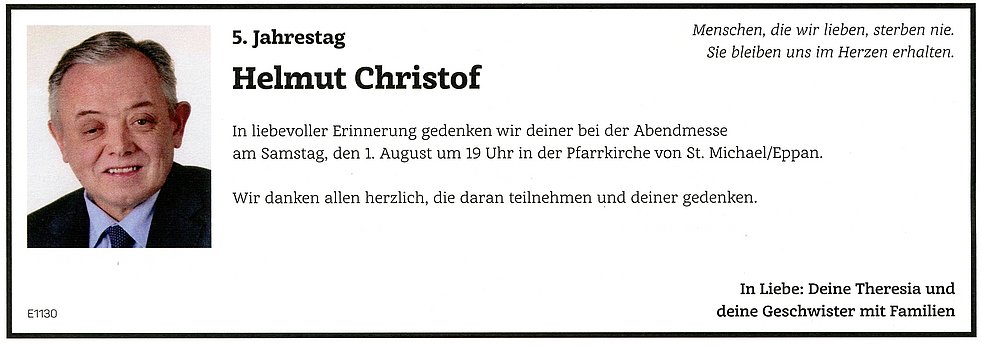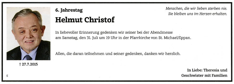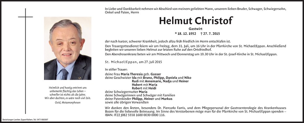 Wir danken den Ärzten, besonders Dr. Piercarlo Farris und dem Pflegepersonal der Gastroenterologie des Krankenhauses Bozen für die liebevolle Betreuung. Im Sinne des Verstorbenen möge man für die Pfarrkirche St. Michael/Eppan (IBAN: IT22 J082 5558 1600 0030 0000 116) spenden.
