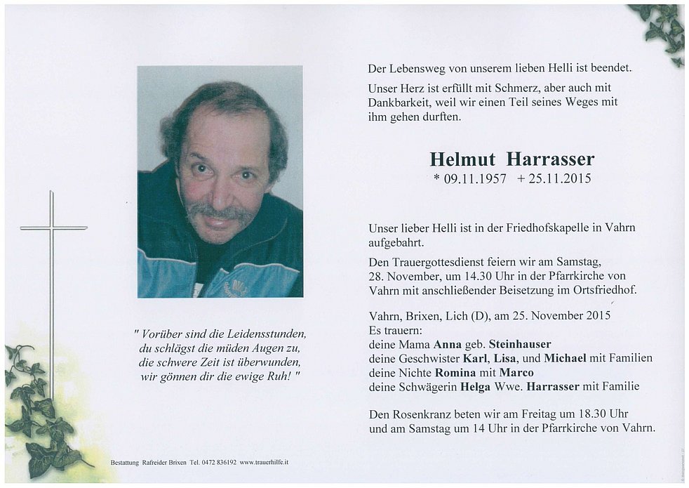 Gedankt sei den Ärzten und dem Pflegerpersonal der Abteilung HNO des Brixner Krankenhauses, dem Hausarzt Dr. Gostner, Frau Edith und dem Hauskrankenpflegedienst, besonders Irmgard, dem Hauspflegedienst Brigitte und Roswitha für die liebevolle Betreuung und allen, die an der Beerdigung teilnehmen.