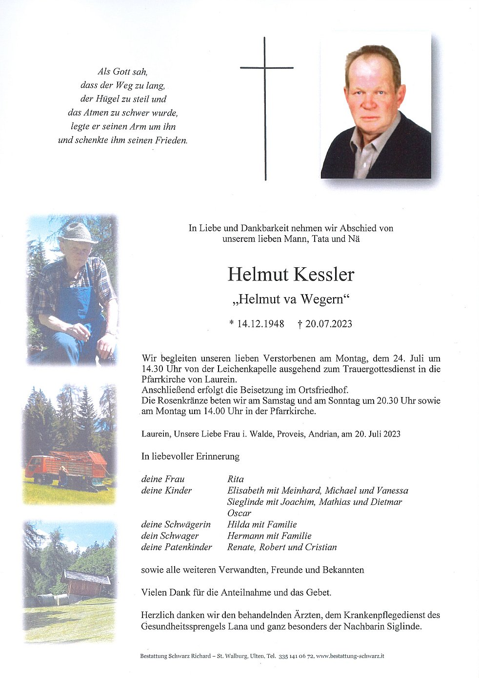 Wir begleiten unseren lieben Verstorbenen am Montag, dem 24. Juli um 14.30 Uhr von der Leichenkapelle ausgehend zum Trauergottesdienst in die Pfarrkirche von Laurein.