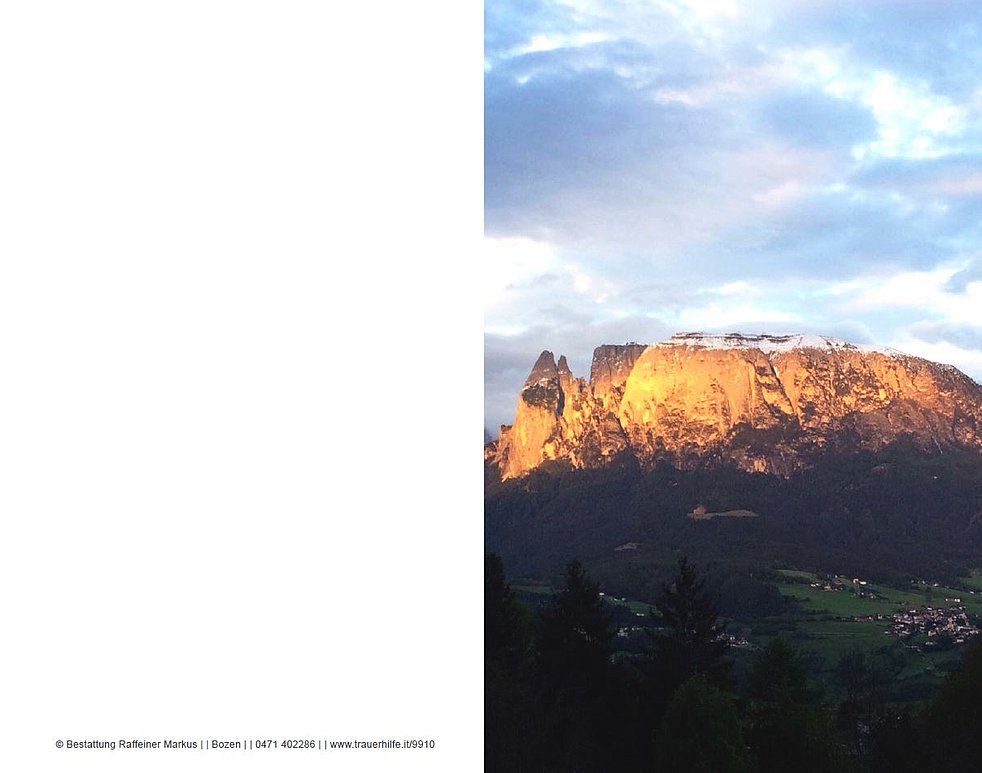 Im Glauben an die Auferstehung feiern wir den Trauergottesdienst mit anschlieβender Einsegnung am Freitag, dem 12. Mai, um 11 Uhr im Dom von Bozen.