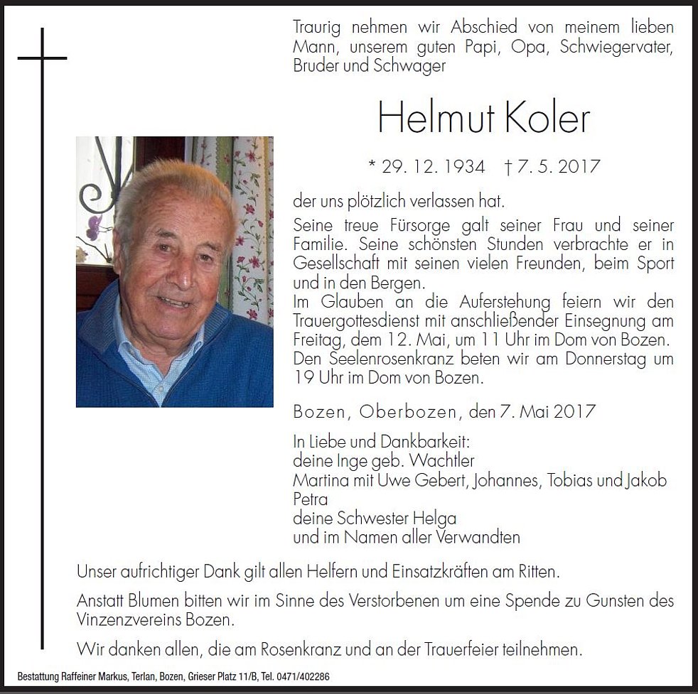 Anstatt Blumen bitten wir im Sinne des Verstorbenen um eine Spende zu Gunsten des Vinzenzvereins Bozen.