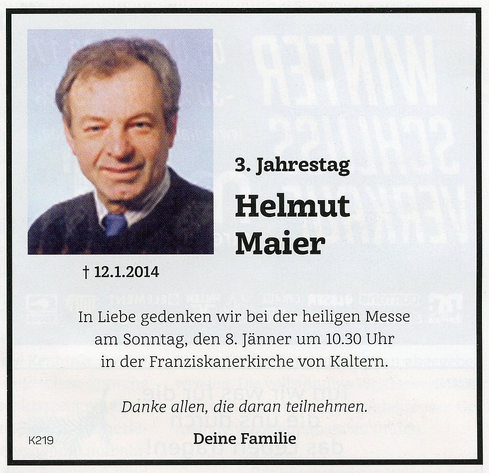 Den Abschiedsgottesdienst feiern wir am Dienstag, den 14. Jänner um 14.30 Uhr in der Pfarrkirche von Kaltern. Anschließend begleiten wir unseren lieben Verstorbenen zum Ortsfriedhof.