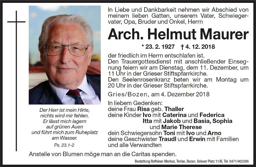 Den Trauergottesdienst mit anschließender Einsegnung feiern wir am Dienstag, dem 11. Dezember, um 11 Uhr in der Grieser Stiftspfarrkirche.