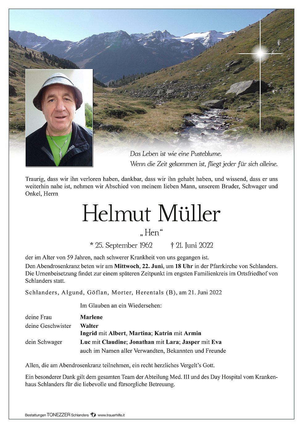Den Abendrosenkranz beten wir am Mittwoch, 22. Juni, um 18 Uhr in der Pfarrkirche von Schlanders. Die Urnenbeisetzung findet zur einem späteren Zeitpunkt im engsten Familienkreis im Ortsfriedhof von Schlanders statt.