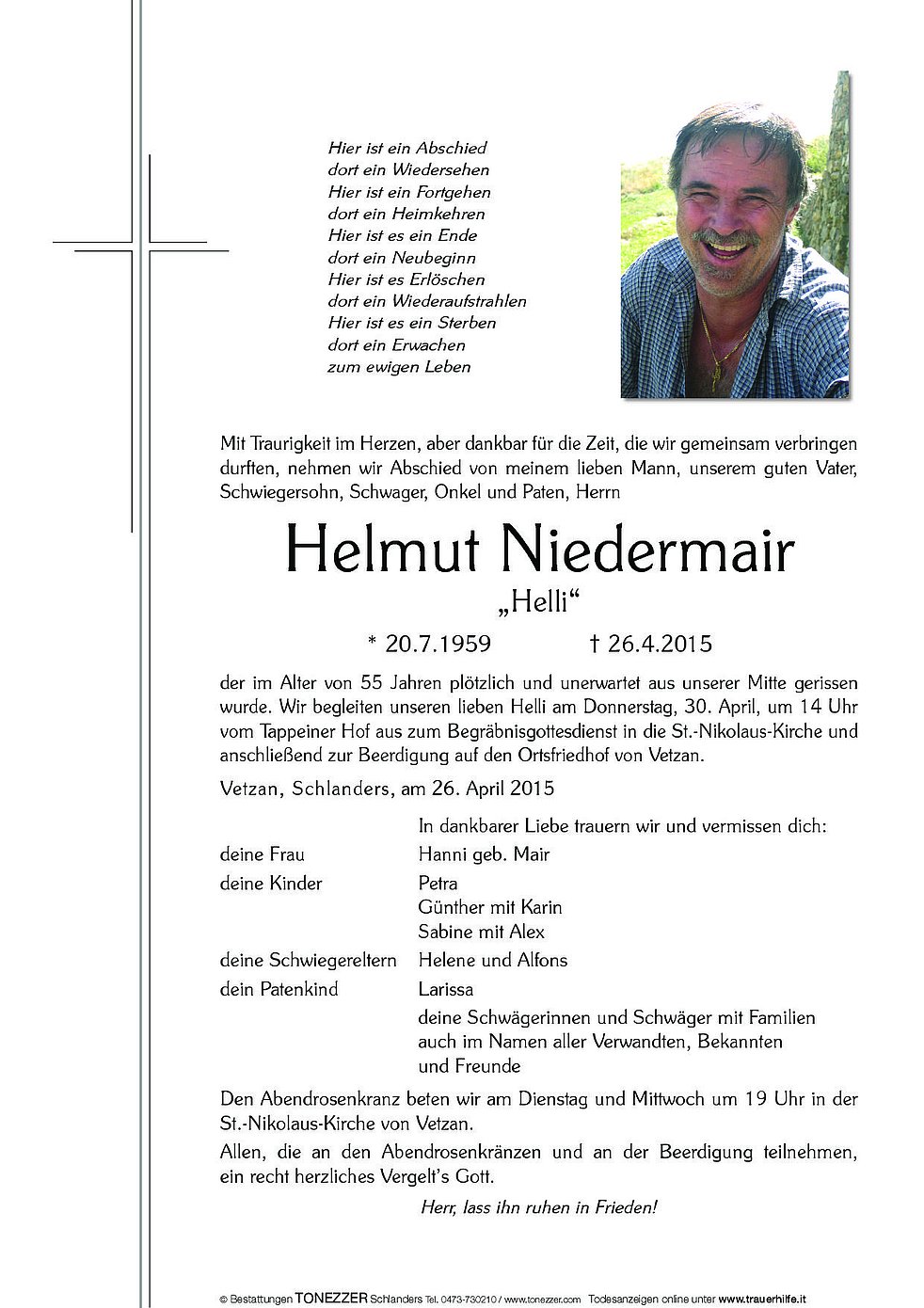 Wir begleiten unseren lieben Helli am Donnerstag, 30. April, um 14 Uhr vom Tappeiner Hof aus zum Begräbnisgottesdienst in die St.-Nikolaus-Kirche und anschließend zur Beerdigung auf den Ortsfriedhof von Vetzan.