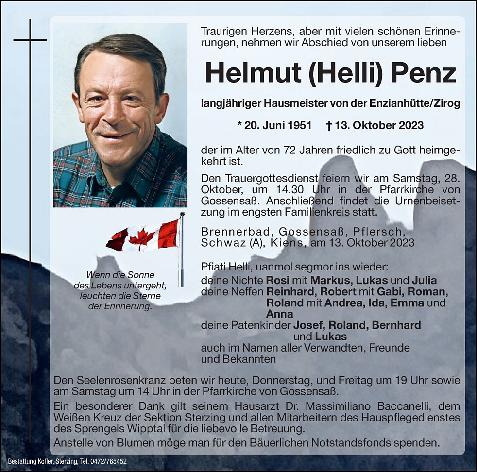 Ein besonderer Dank gilt seinem Hausarzt Dr. Massimiliano Baccanelli, dem Weißen Kreuz der Sektion Sterzing und allen Mitarbeitern des Hauspflegedienstes des Sprengels Wipptal für die liebevolle Betreuung.