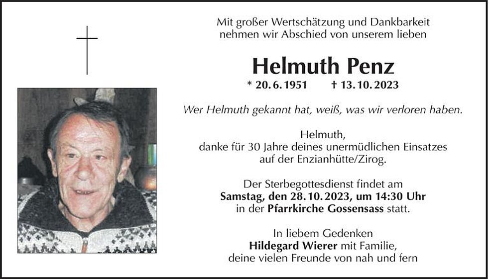 Den Trauergottesdienst feiern wir am Samstag, 28. Oktober, um 14.30 Uhr in der Pfarrkirche von Gossensaß. Anschließend findet die Urnenbeisetzung im engsten Familienkreis statt.