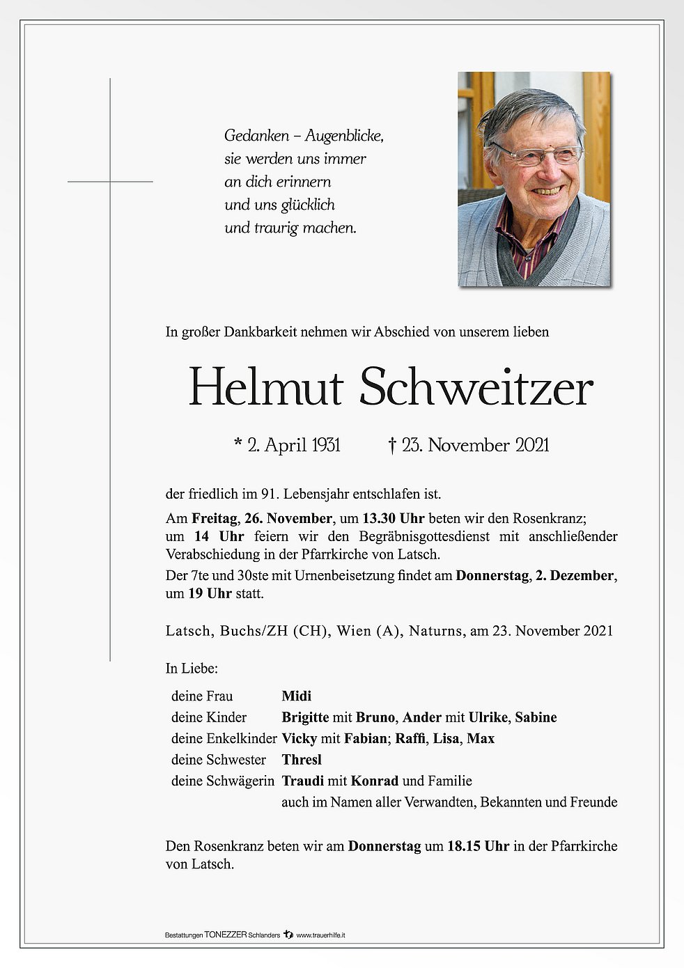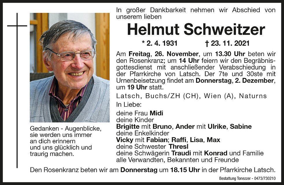 Der 7te und 30ste mit Urnenbeisetzung findet am Donnerstag, 2. Dezember, um 19 Uhr statt.