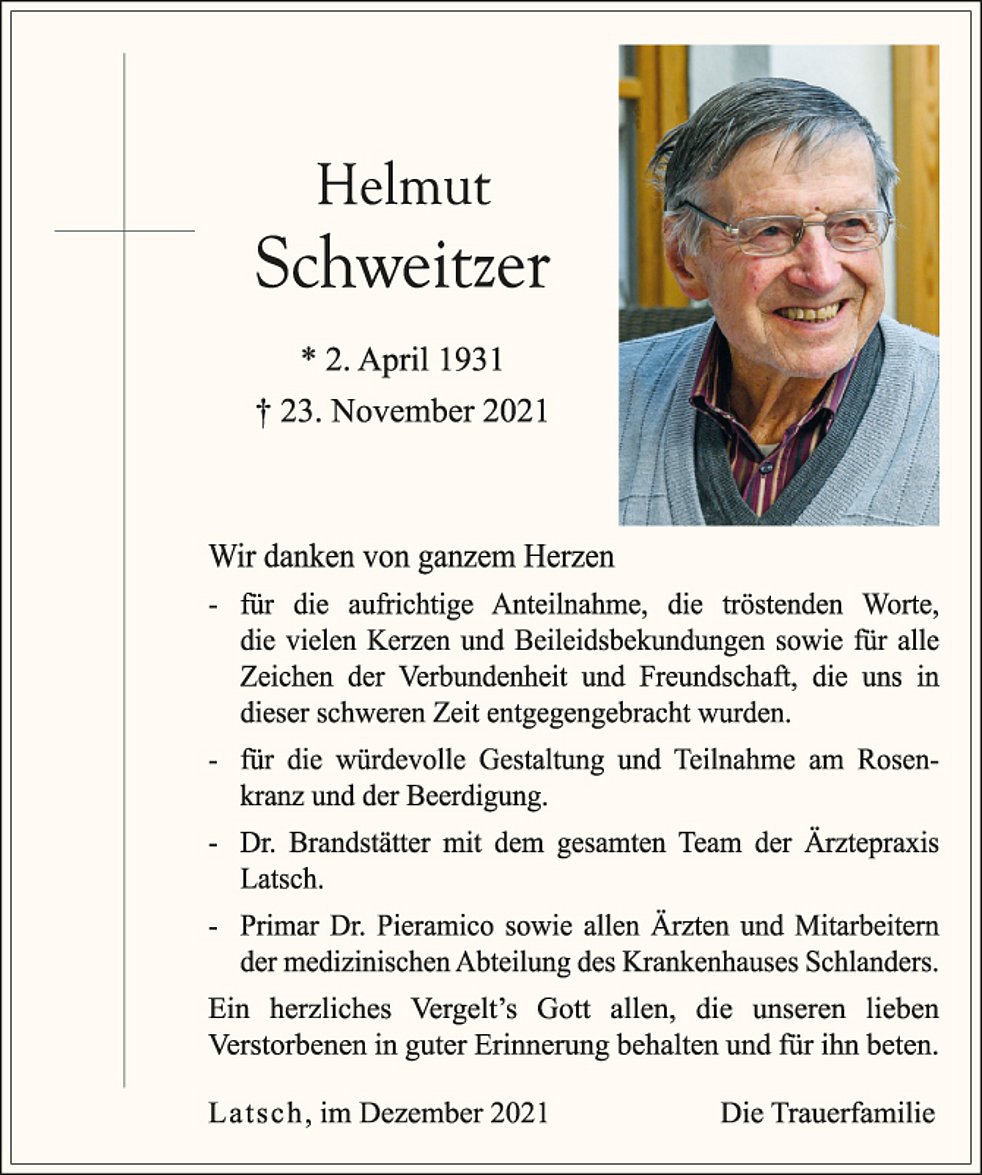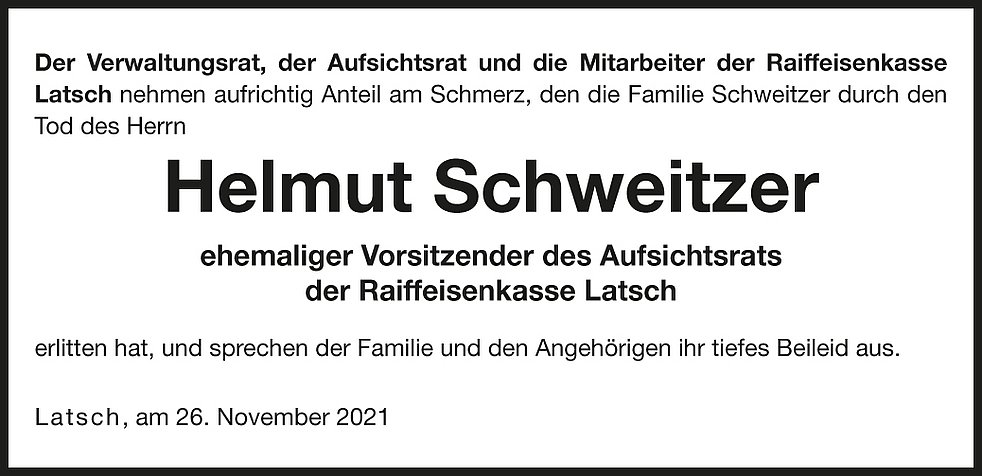 um 14 Uhr feiern wir den Begräbnisgottesdienst mit anschließender Verabschiedung in der Pfarrkirche von Latsch.