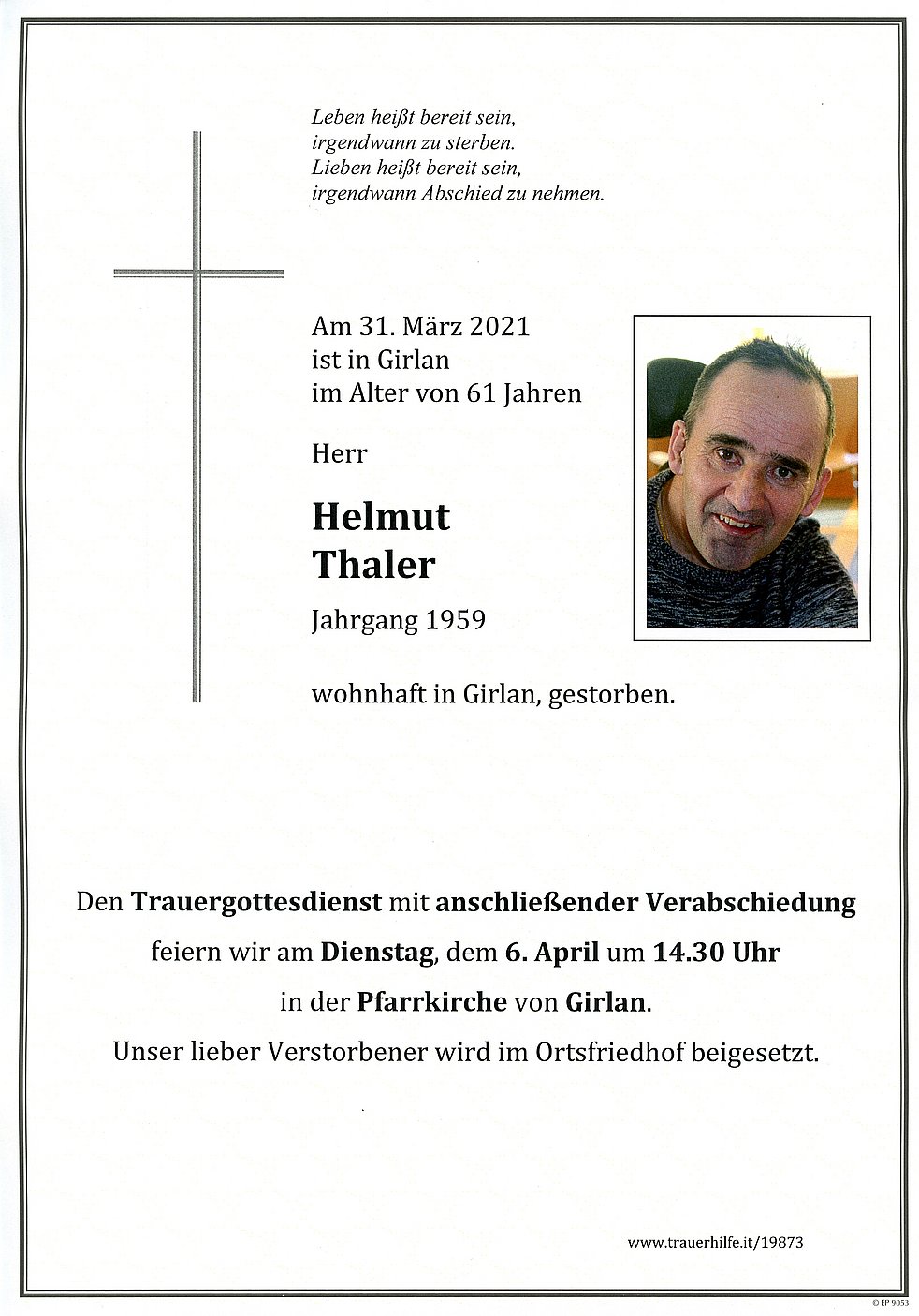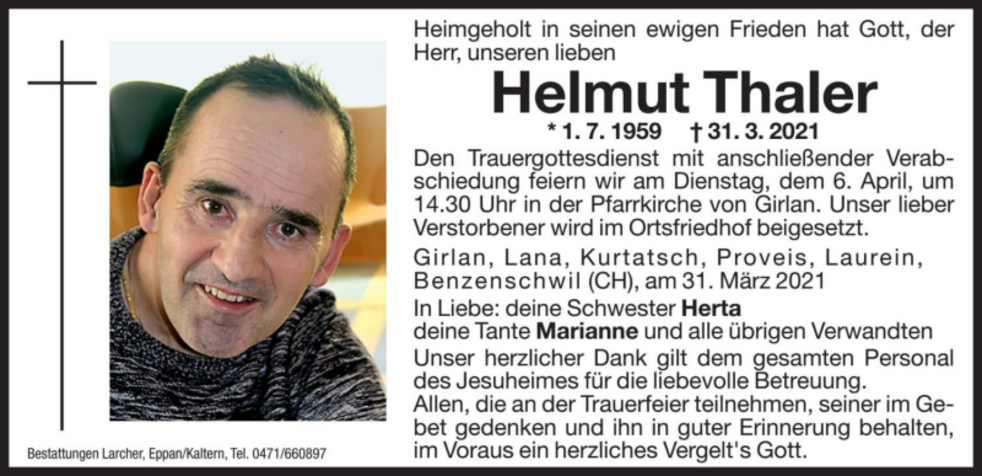 Den Trauergottesdienst mit anschließender Verabschiedung feiern wir am Dienstag, dem 6. April um 14.30 Uhr in der Pfarrkirche von Girlan.