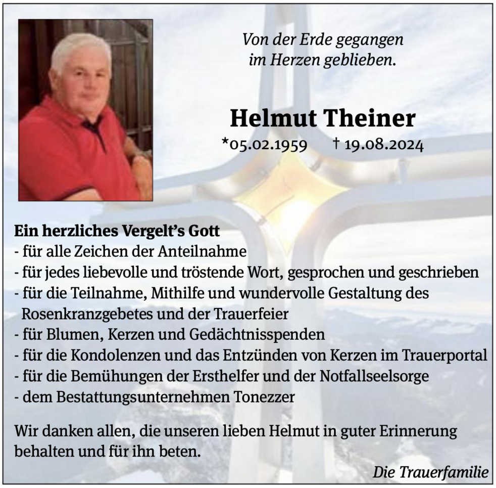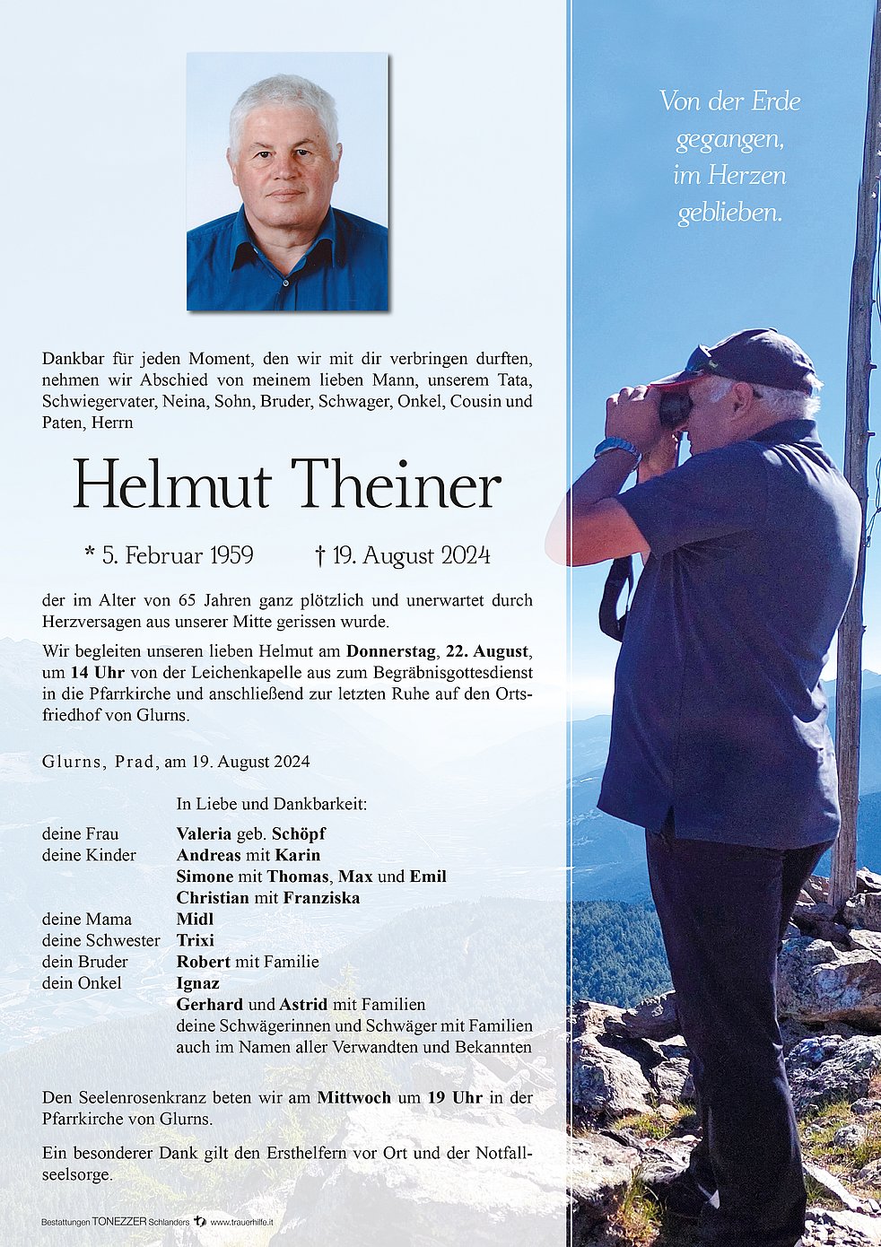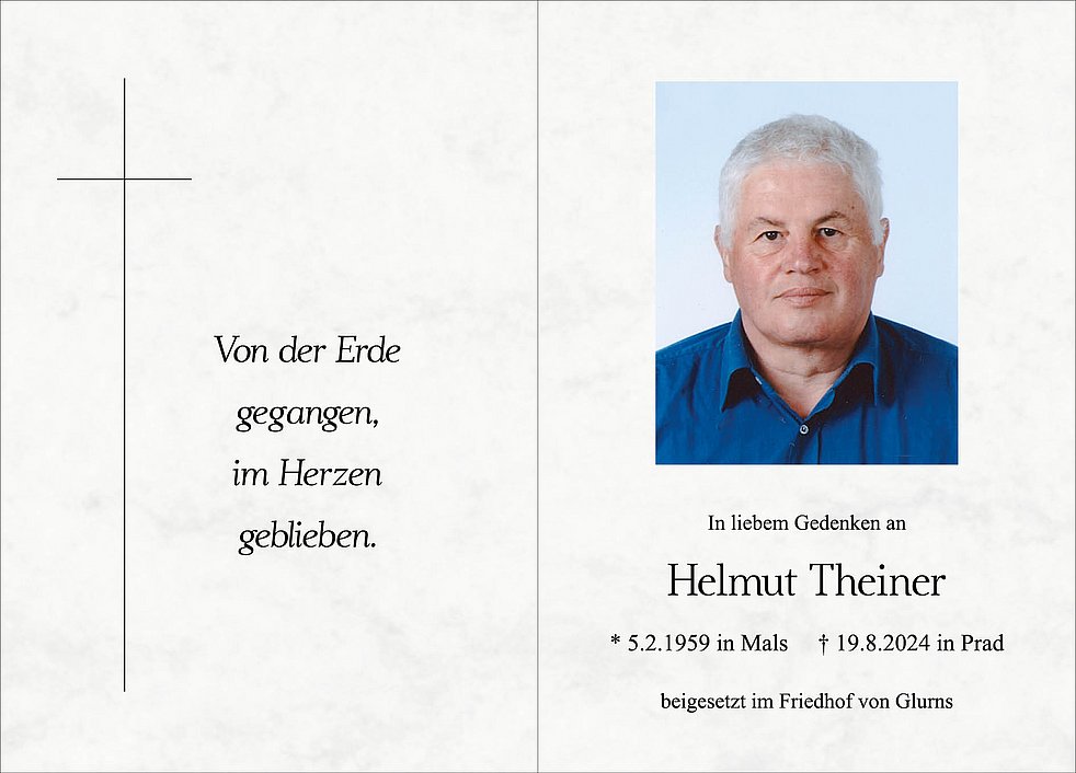 Wir begleiten unseren lieben Helmut am Donnerstag, 22. August, um 14 Uhr von der Leichenkapelle aus zum Begräbnisgottesdienst in die Pfarrkirche und anschließend zur letzten Ruhe auf den Ortsfriedhof von Glurns.