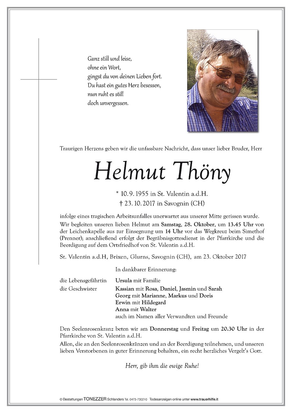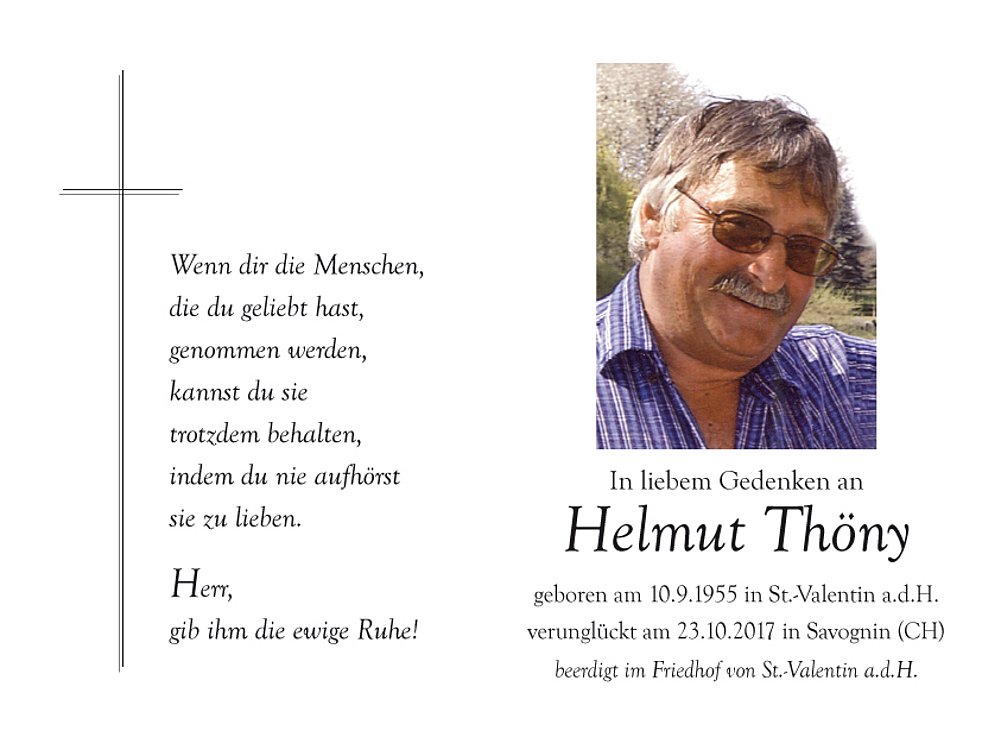 Wir begleiten unseren lieben Helmut am Samstag, 28. Oktober, um 13.45 Uhr von der Leichenkapelle aus zur Einsegnung um 14 Uhr vor das Wegkreuz beim Simethof (Prenner); anschließend erfolgt der Begräbnisgottesdienst in der Pfarrkirche und die Beerdigung auf dem Ortsfriedhof von St. Valentin a.d.H.