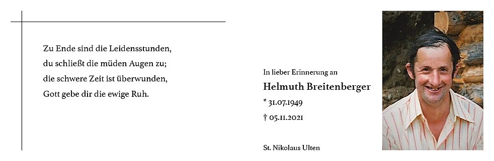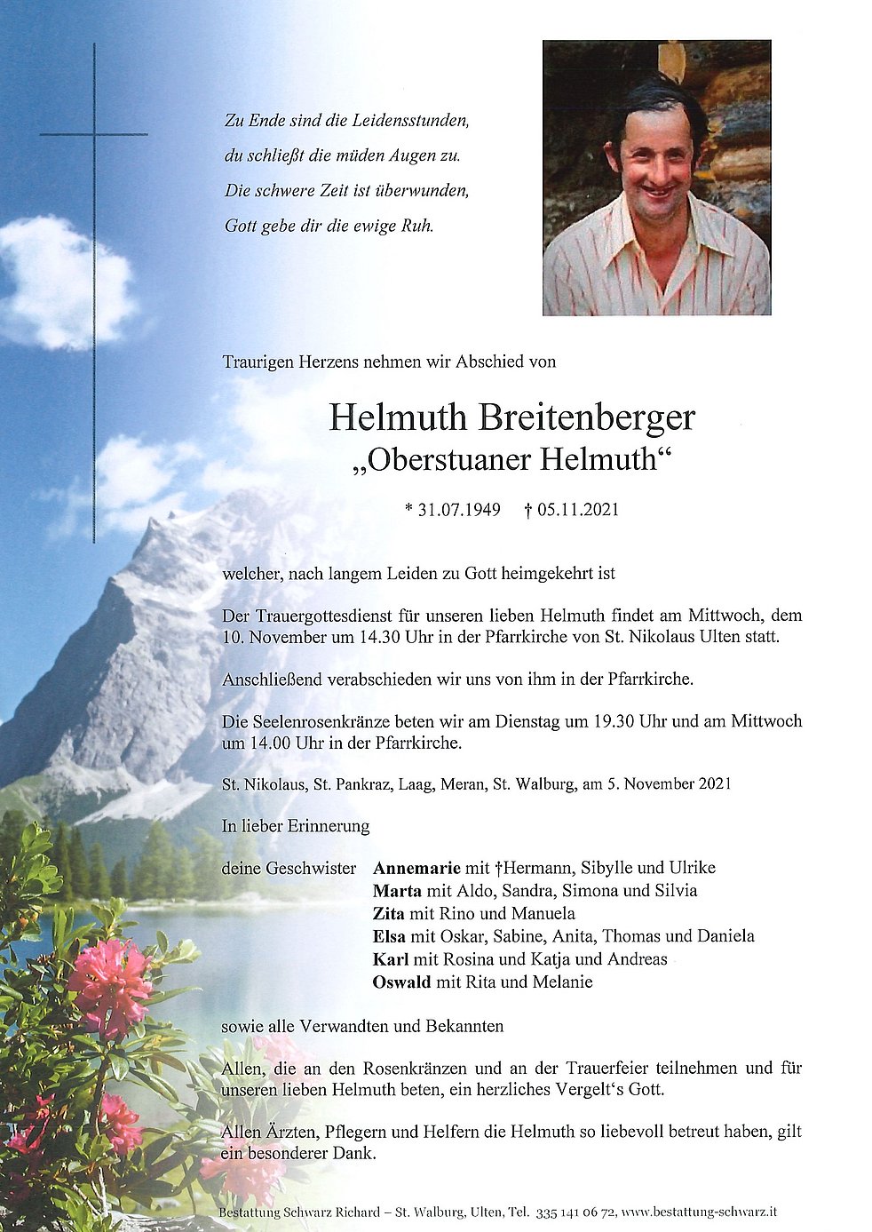 Der Trauergottesdienst für unseren lieben Helmuth findet am Mittwoch, dem 10. November um 14.30 Uhr in der Pfarrkirche von St. Nikolaus Ulten statt.