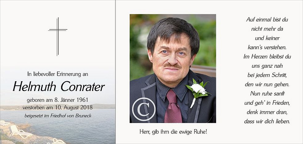 Voller Trauer im Herzen, aber dankbar für all seine Liebe und Fürsorge, nehmen wir Abschied von meinem innigst geliebten Mann, unserem lieben Tata, Opa, Sohn, Bruder, Schwager, Onkel, Cousin und Freund