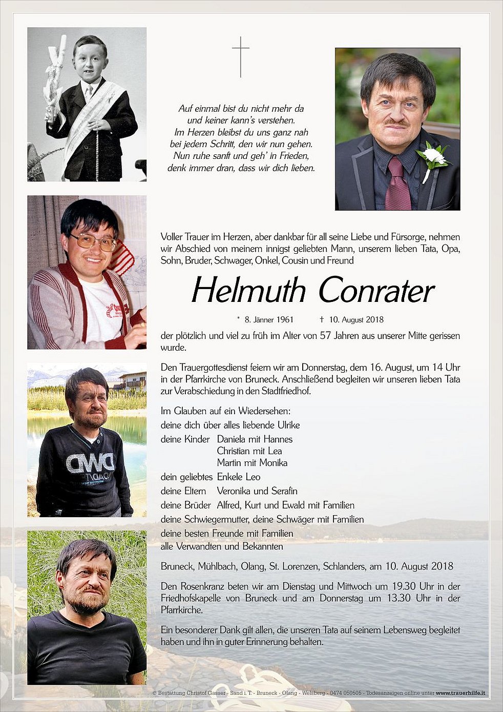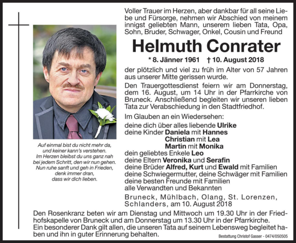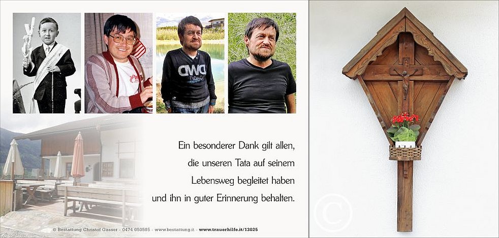 Den Trauergottesdienst feiern wir am Donnerstag, dem 16. August, um 14 Uhr in der Pfarrkirche von Bruneck. Anschließend begleiten wir unseren lieben Tata zur Verabschiedung in den Stadtfriedhof.