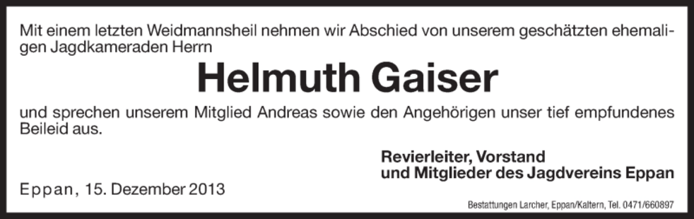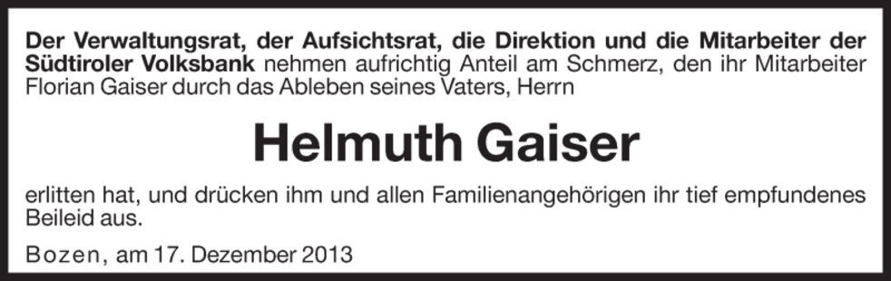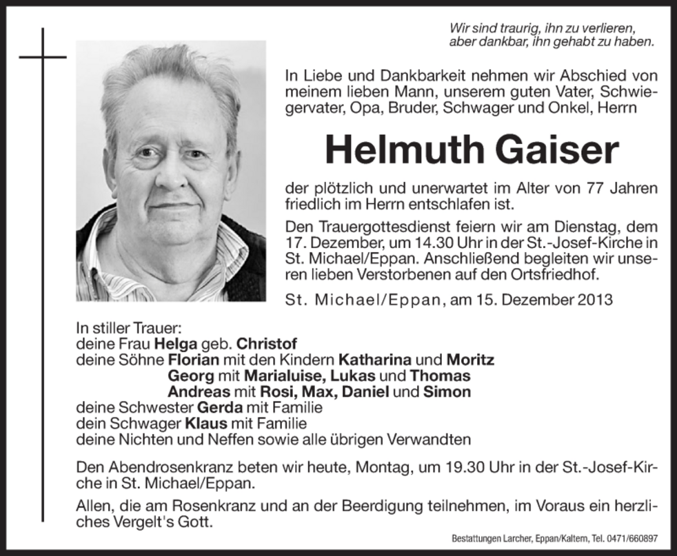 Den Trauergottesdienst feiern wir am Dienstag, den 17. Dezember, um 14.30 Uhr in der St. Josefs - Kirche in St. Michael/Eppan.