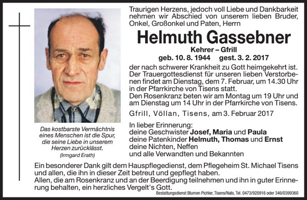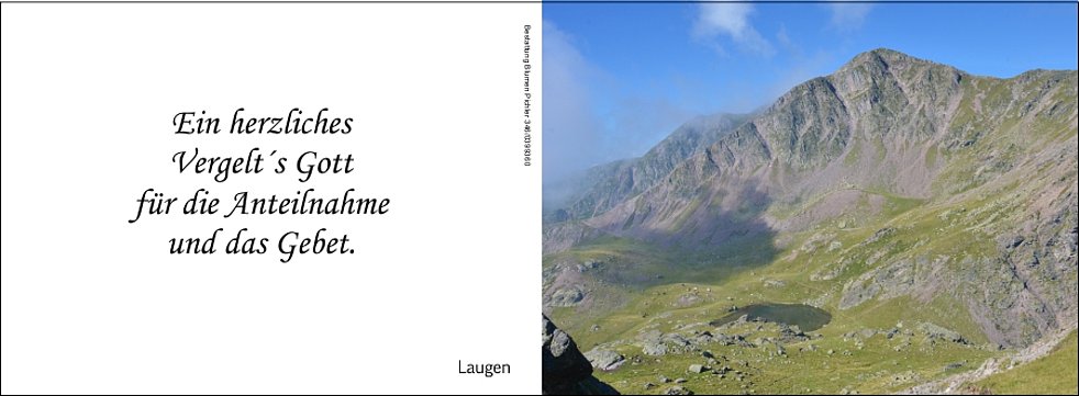 Ein besonderer Dank gilt dem Hauspflegedienst, dem Pflegeheim St. Michael Tisens und allen, die ihn in dieser Zeit betreut und gepflegt haben. Allen, die am Rosenkranz und an der Beerdigung teilnehmen und ihn in guter Erinnerung behalten, ein herzliches Vergelt`s Gott.