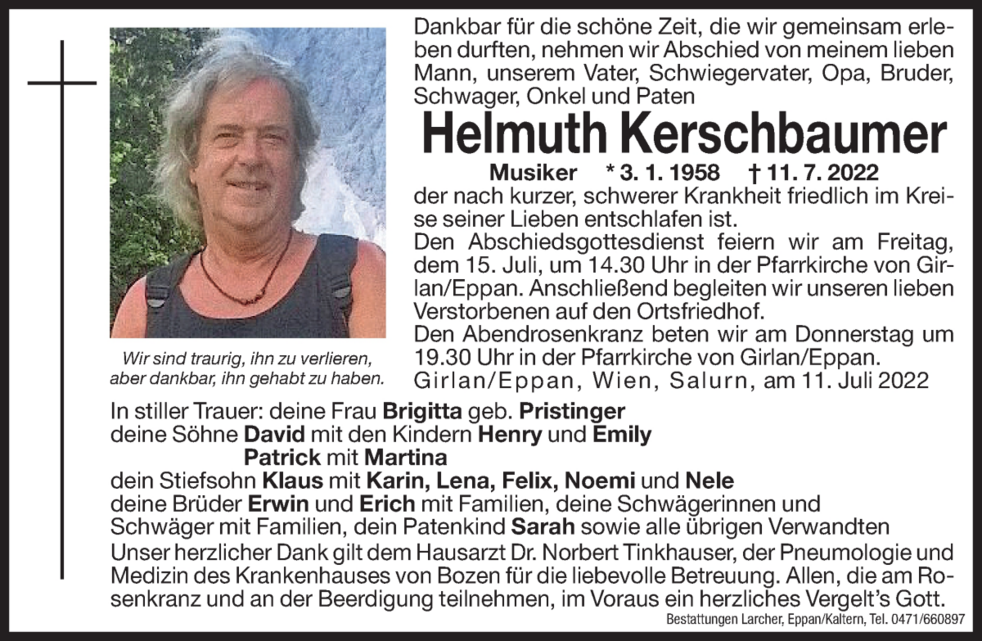Unser herzlicher Dank gilt dem Hausarzt Dr. Norbert Tinkhauser, der Pneumologie und Medizin des Krankenhauses Bozen für die liebevolle Betreuung.