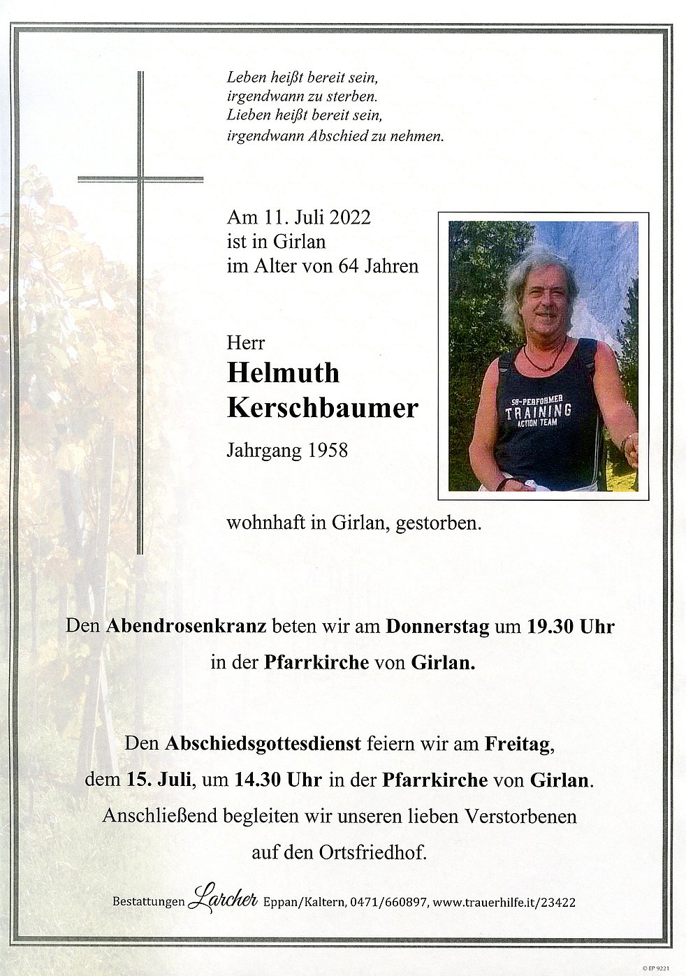 Allen, die am Rosenkranz und an der Beerdigung teilnehmen, im Voraus ein herzliches Vergelt’s Gott.