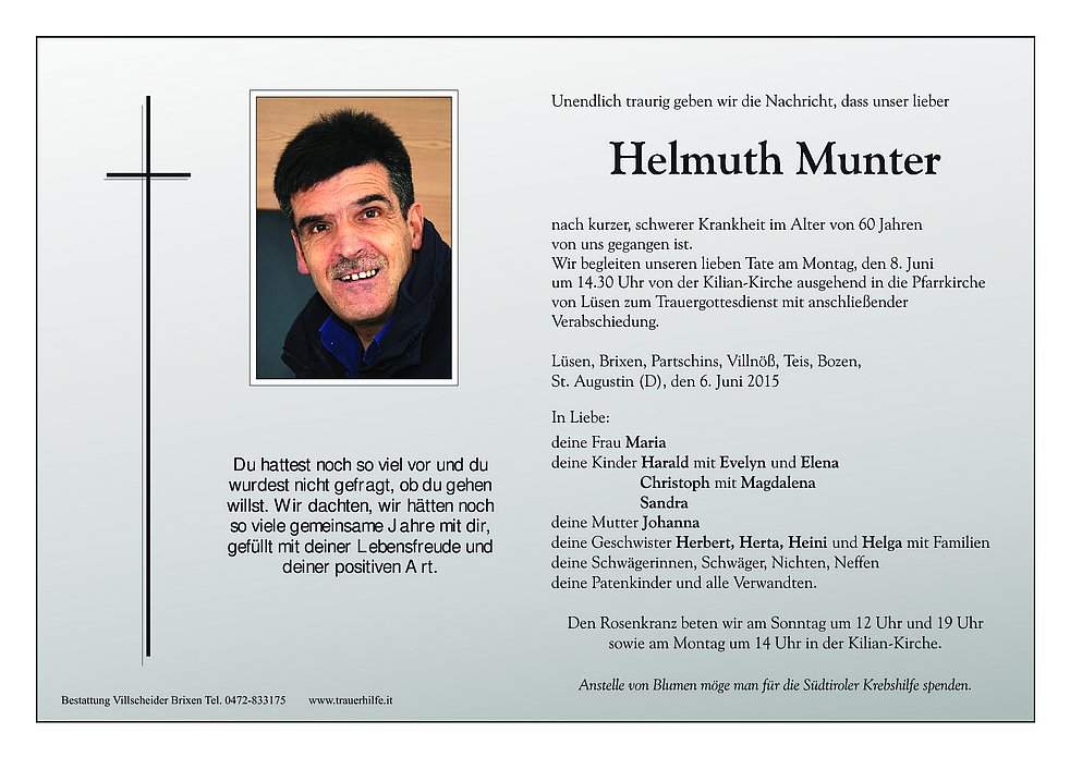 Anstelle von Blumen möge man für die Südtiroler Krebshilfe spenden.