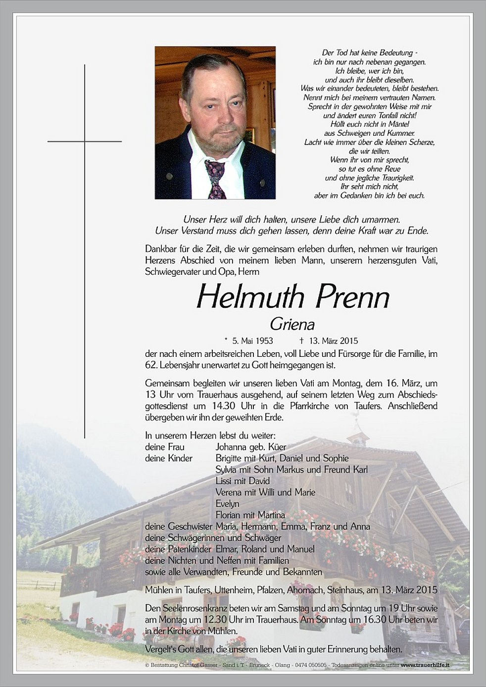 13 Uhr vom Trauerhaus ausgehend, auf seinem letzten Weg zum Abschieds-gottesdienst um 14.30 Uhr in die Pfarrkirche von Taufers. Anschließend übergeben wir ihn der geweihten Erde.