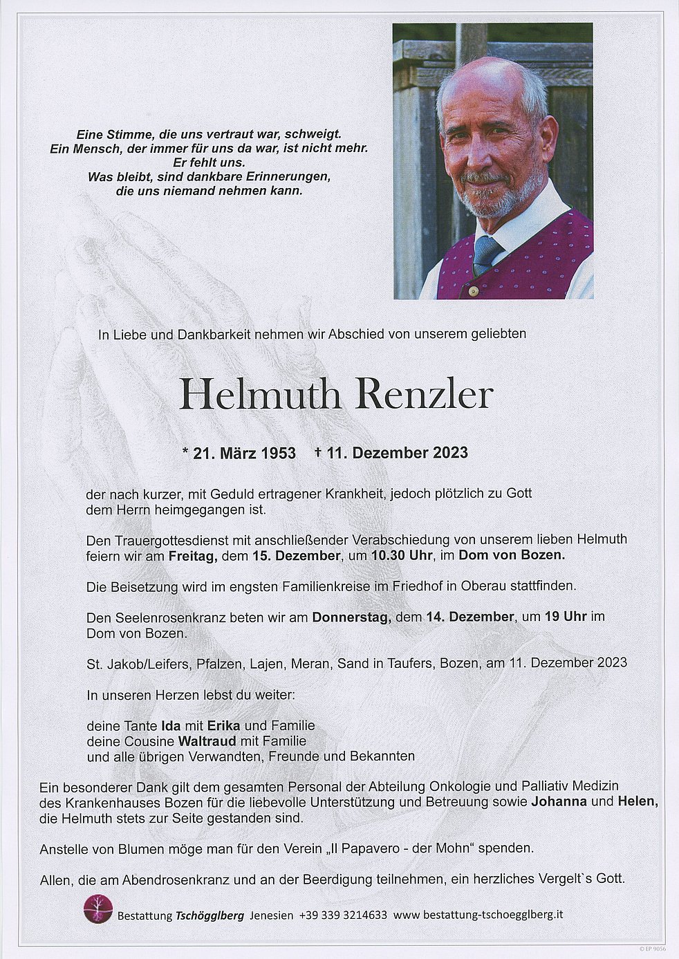 Den Trauergottesdienst mit anschließender Verabschiedung von unserem lieben Helmuth feiern wir am Freitag, dem 15. Dezember, um 10.30 Uhr, im Dom von Bozen.