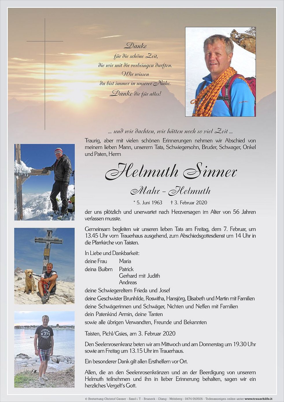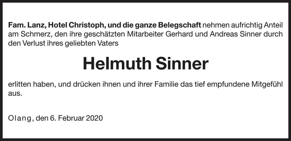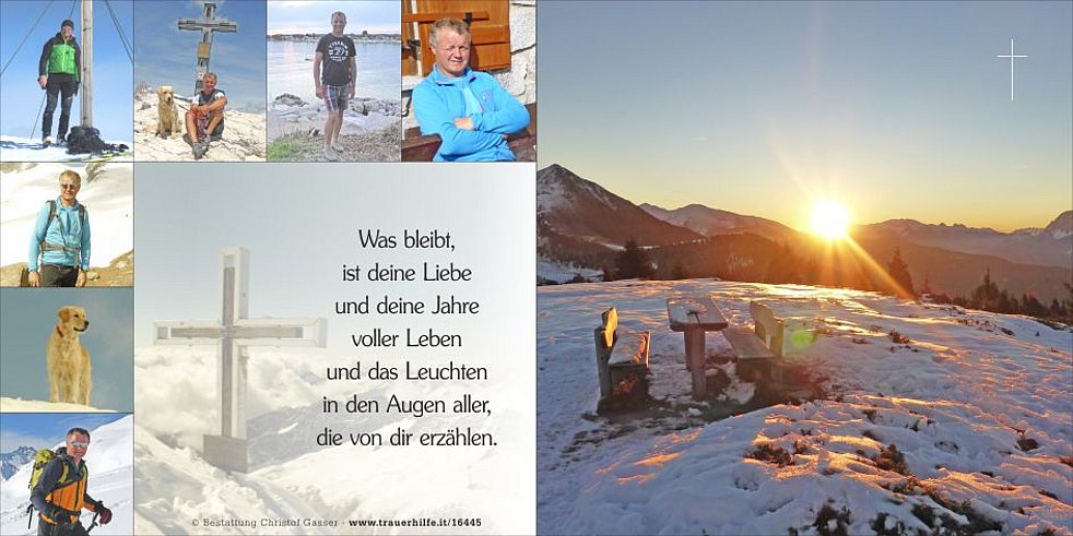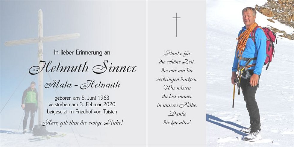 Gemeinsam begleiten wir unseren lieben Tata am Freitag, dem 7. Februar, um 13.45 Uhr vom Trauerhaus ausgehend, zum Abschiedsgottesdienst um 14 Uhr in die Pfarrkirche von Taisten.